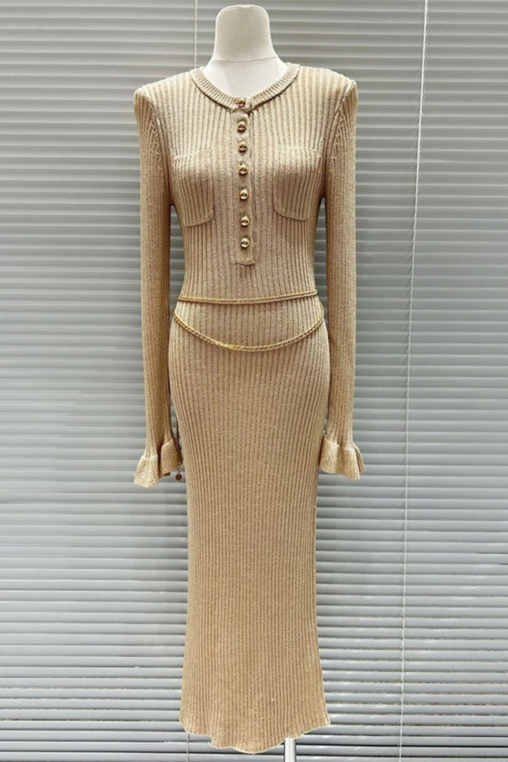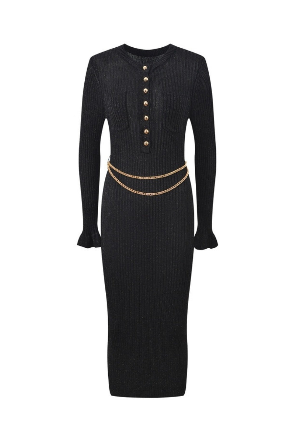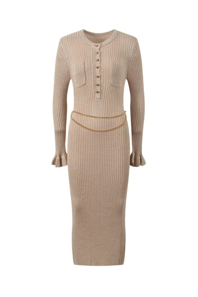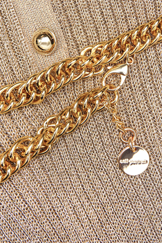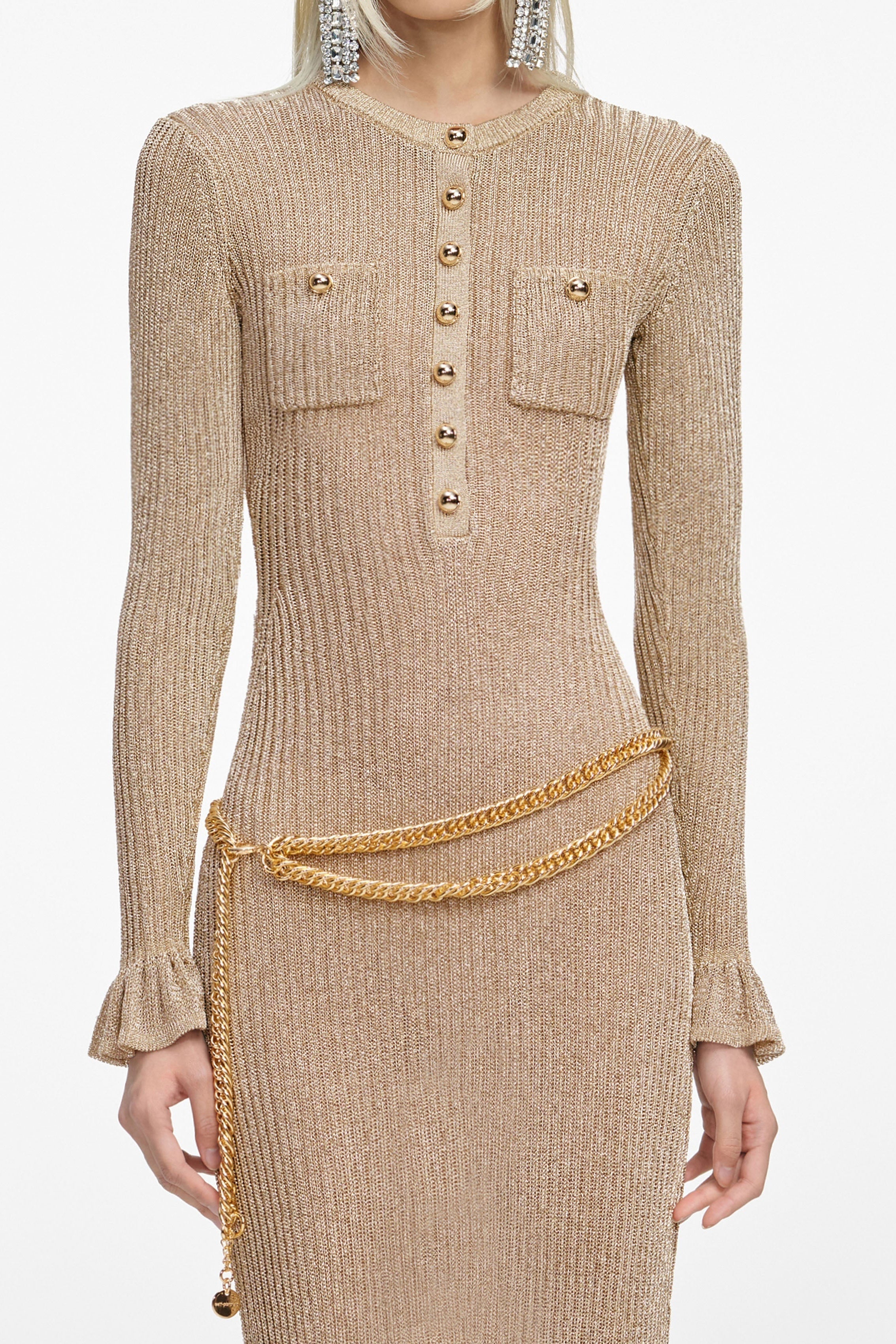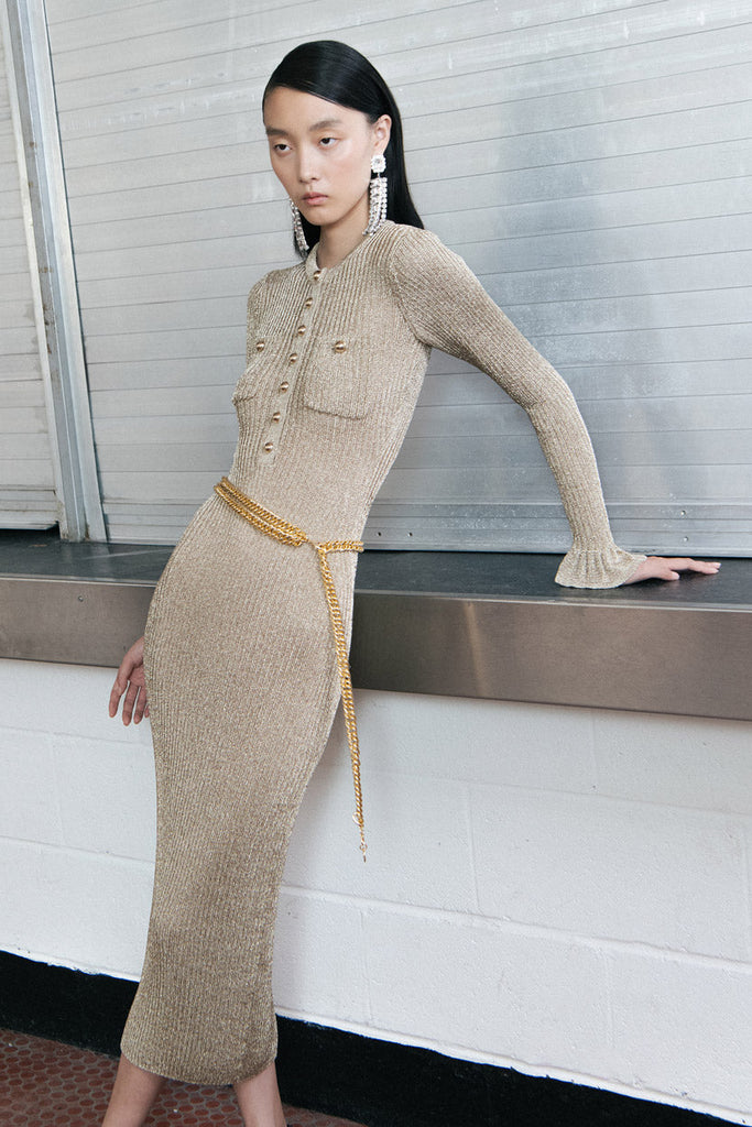 Crafted from lurex knit, this gold midi dress comes with built-in shimmer. Gold buttons and a detachable chain belt double down on the more-is-more aesthetic – ready for a glamorous night out.