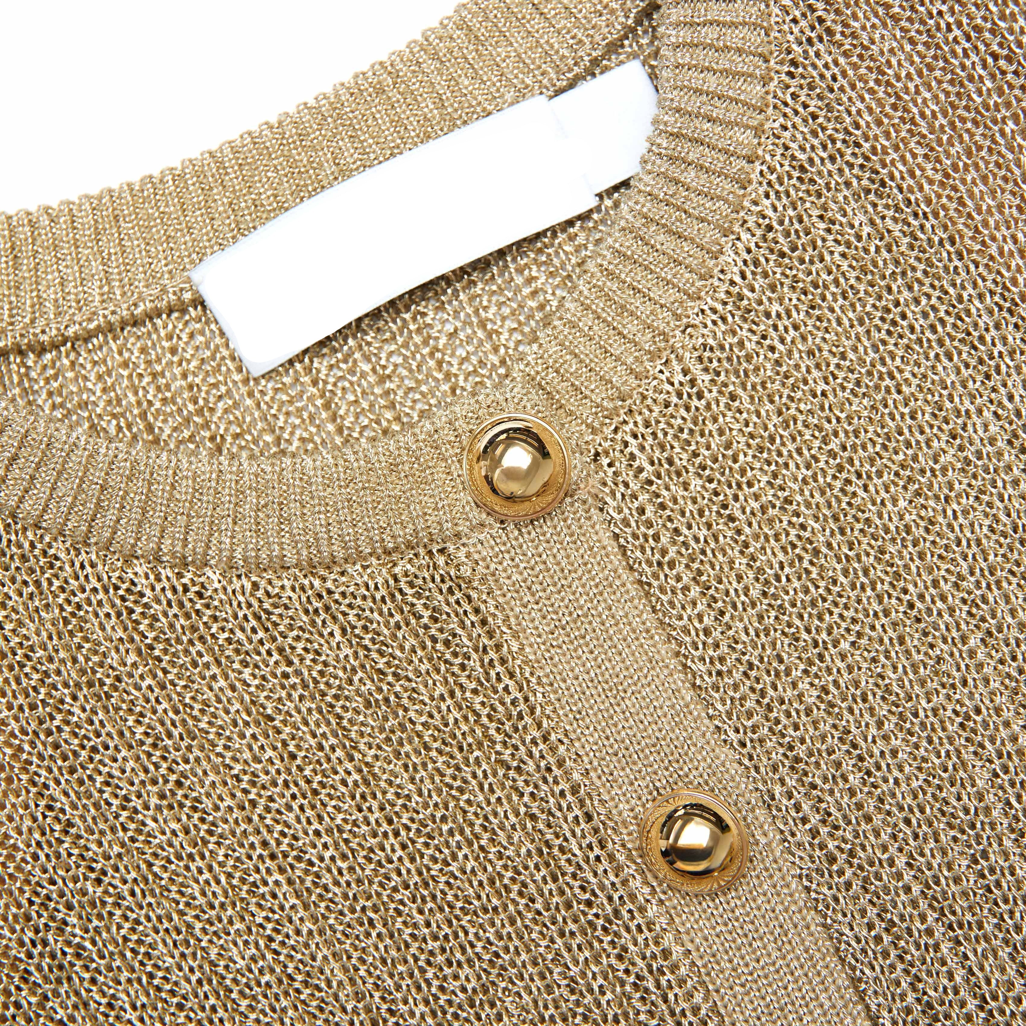 Gold lurex knit gives this flattering mini dress its tactile feel and photo-friendly shimmer. Framed by a strong shouldered silhouette and gold buttons – add heels to shine at the next soirée.