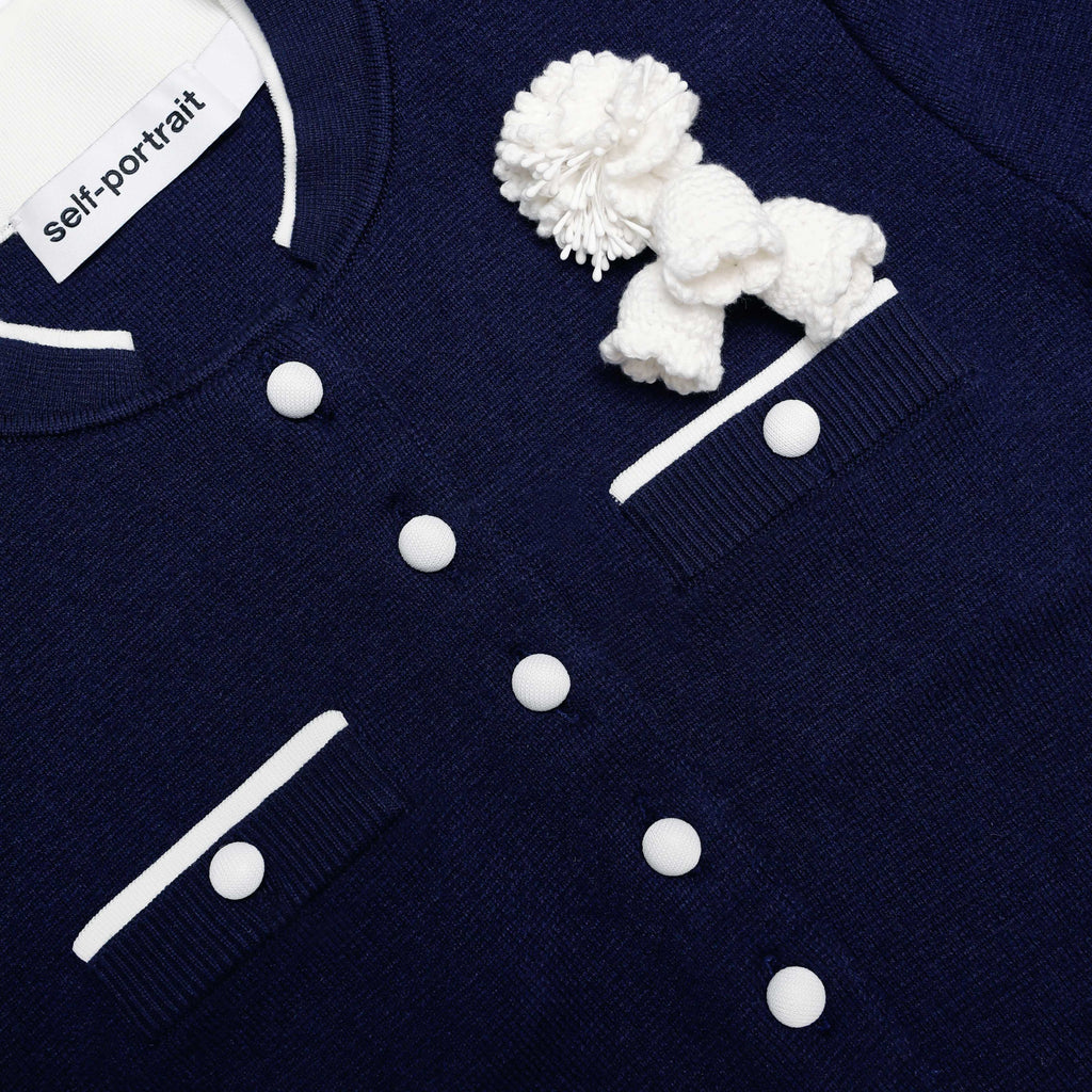 Irresistibly soft, this knit midi dress curves to the figure with sensual effect. White contrast trims and buttons add a touch of prep, accented with a crochet flower brooch for extra romance.