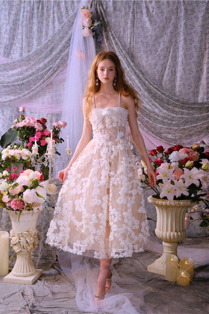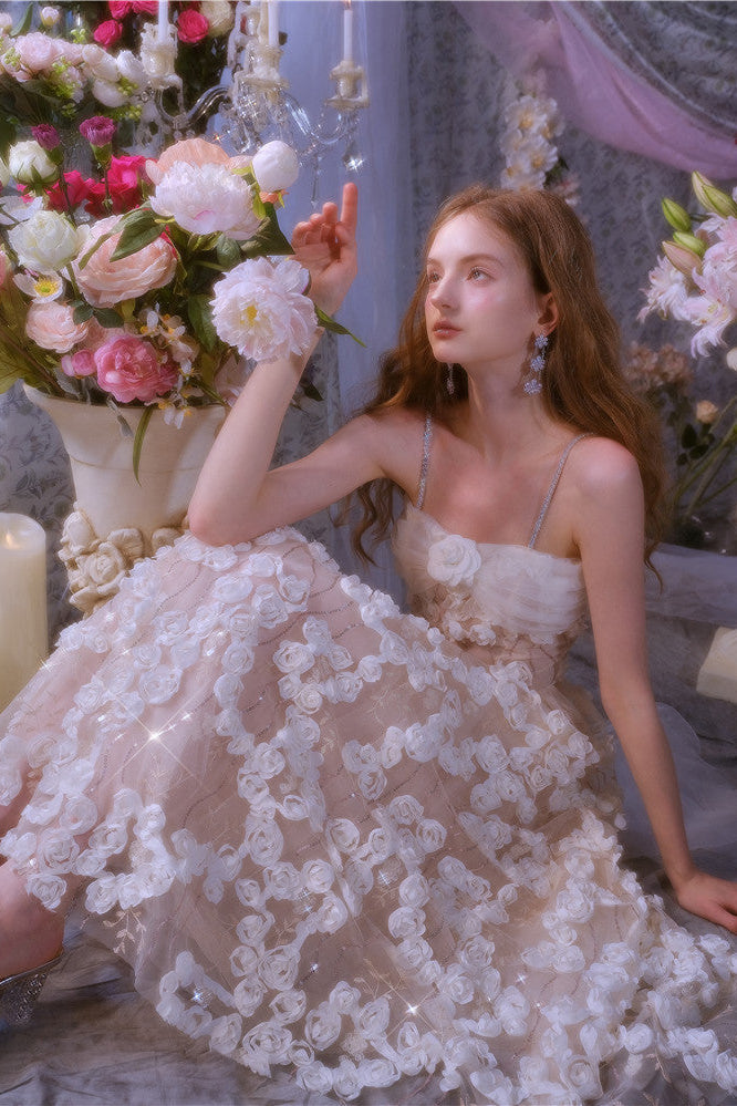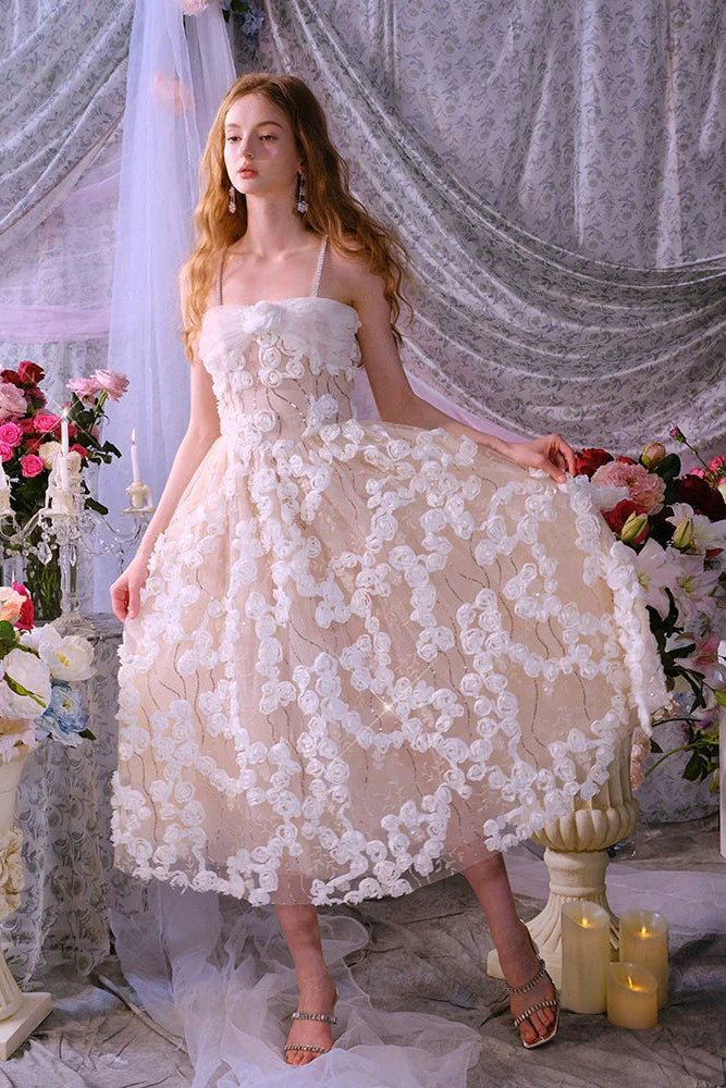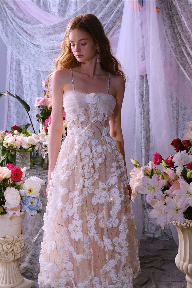 Exquisitely crafted with elegant details, this dress is a symbol of timeless beauty. Its lovely design and delicate diamond chain flowers will make you stand out at any event. Elevate your wardrobe with this exclusive piece.
