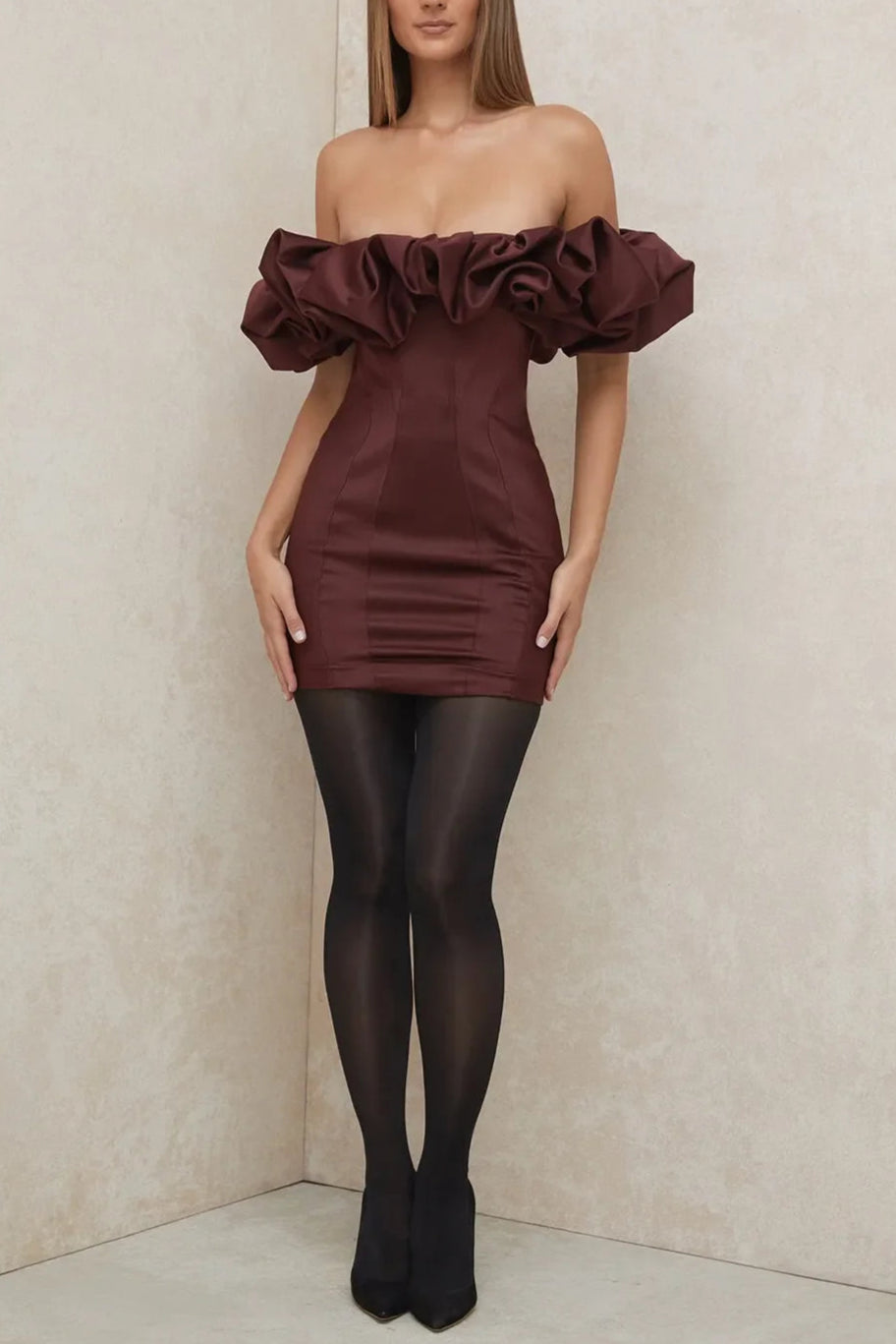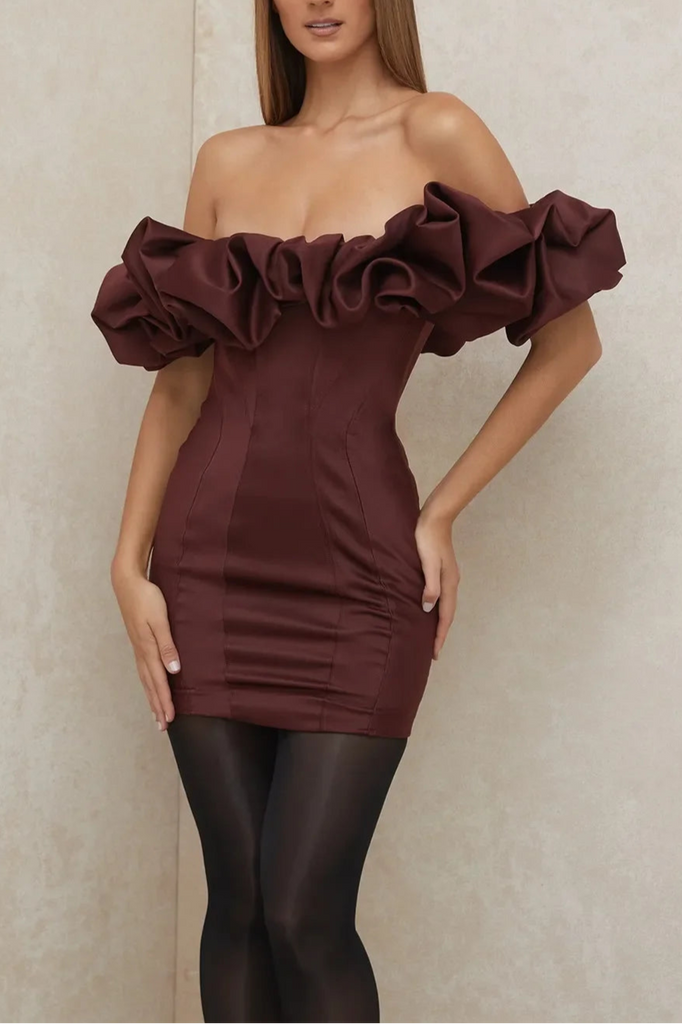 Elevate your evening wardrobe with this burgundy satin strapless mini dress, featuring delicate ruffle detailing for a refined silhouette. The lustrous satin fabric enhances the rich hue, while the strapless design highlights the neckline elegantly. Perfectly tailored to accentuate your figure, this dress combines sophistication with a playful edge, ideal for special occasions or upscale events.