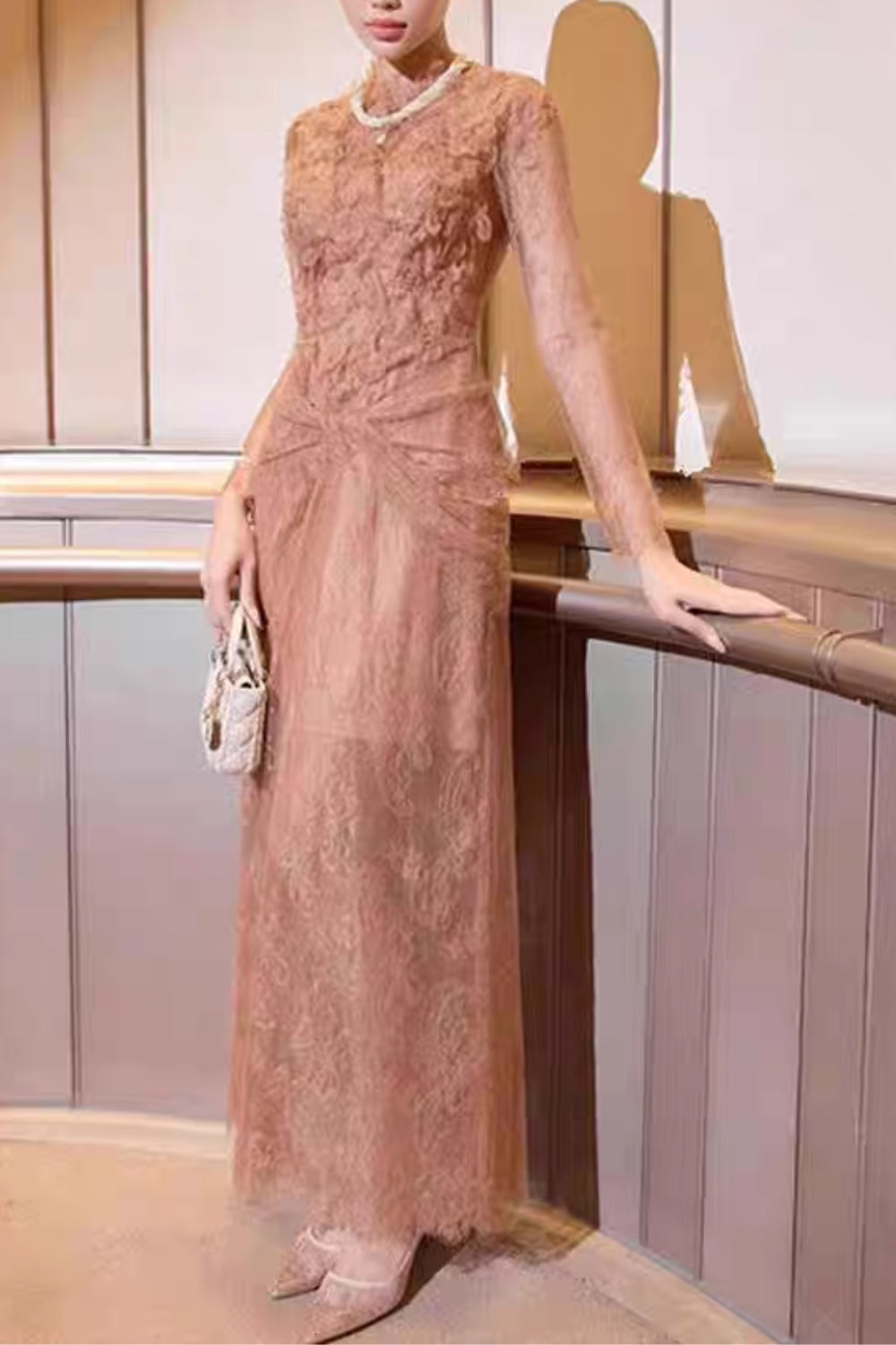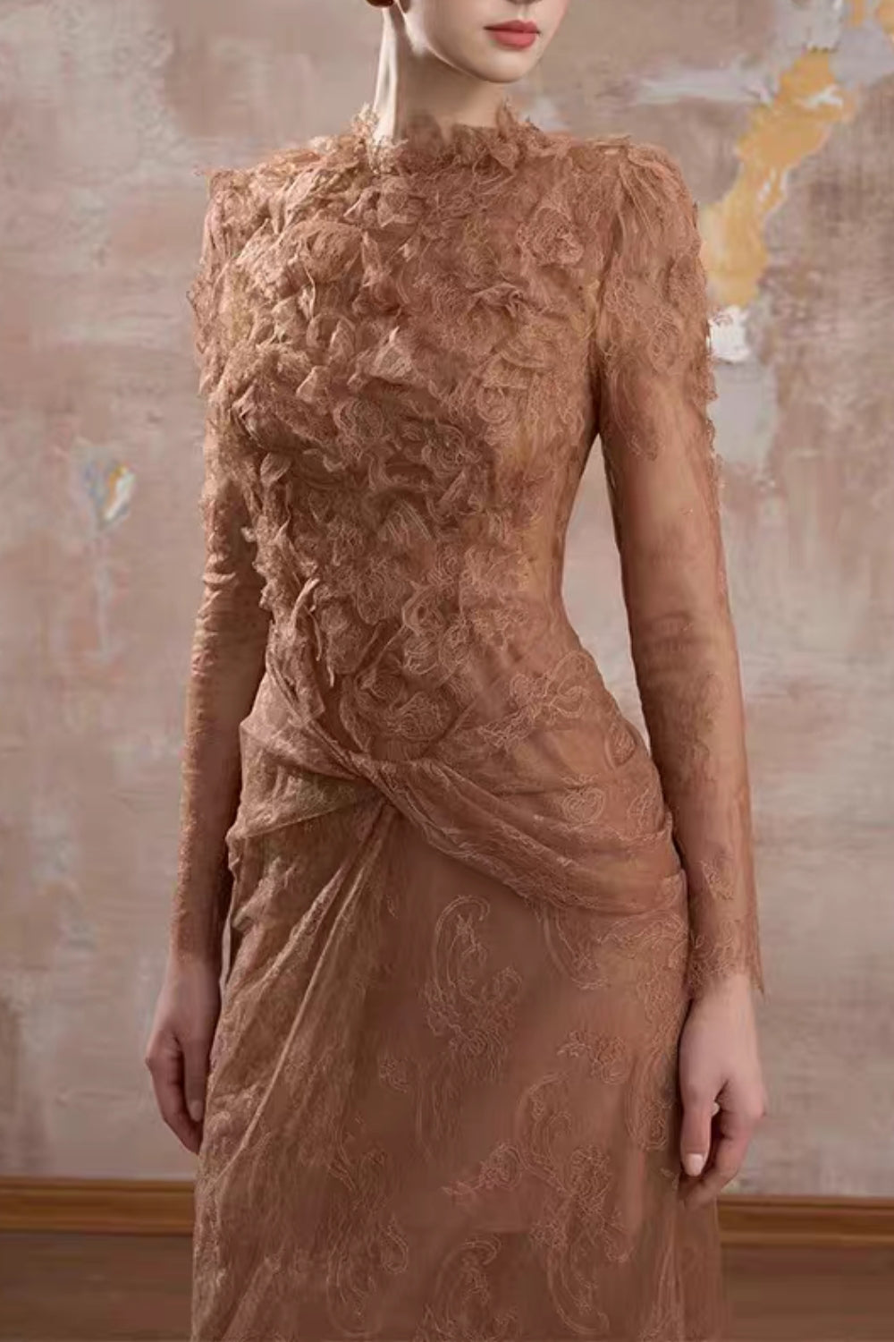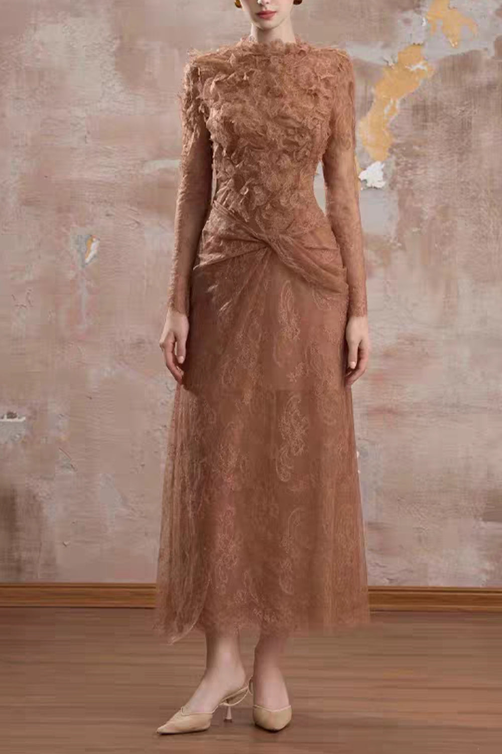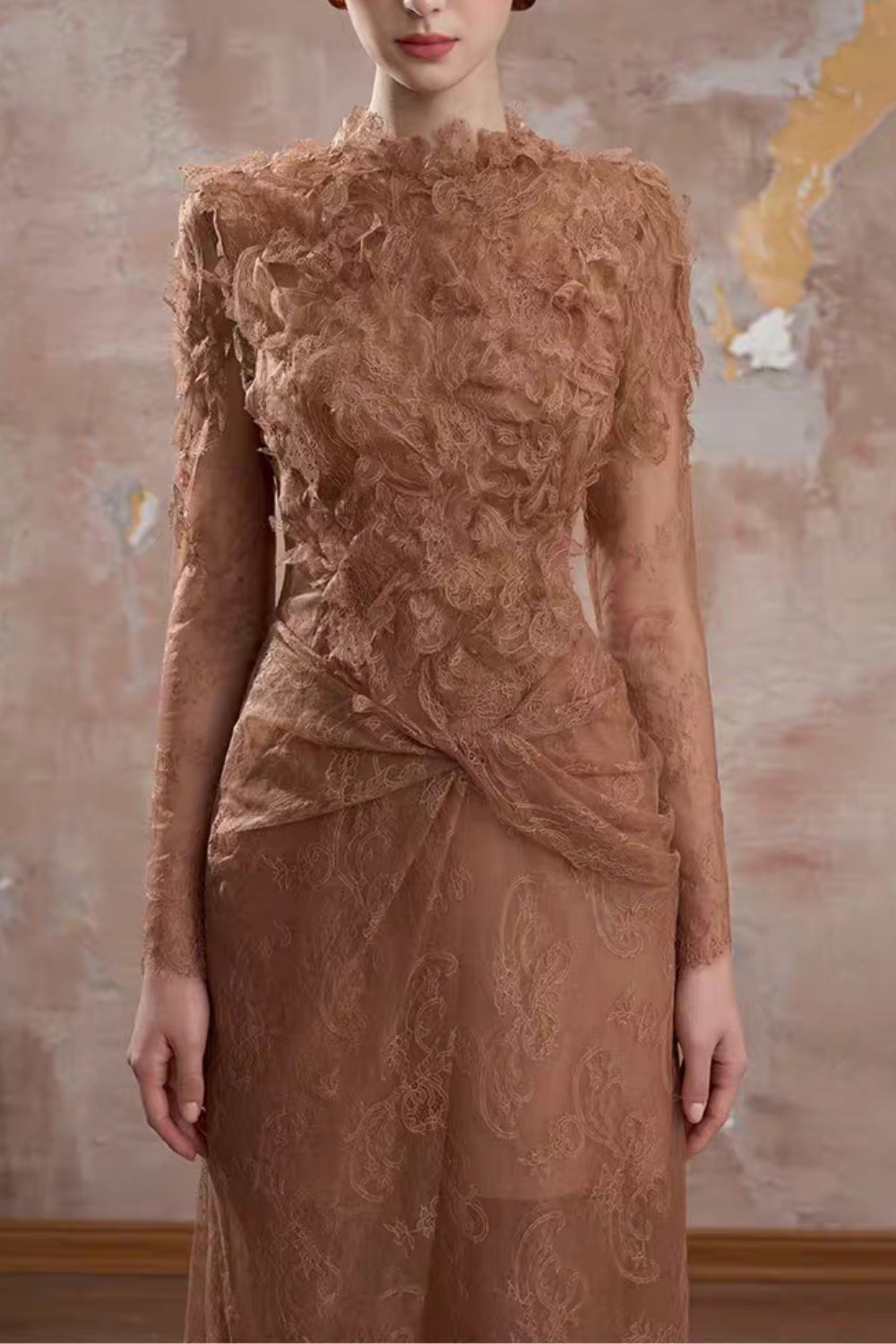 Bodycon Long Sleeve Organza Maxi Dress In Brown