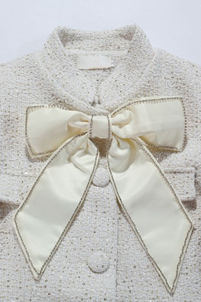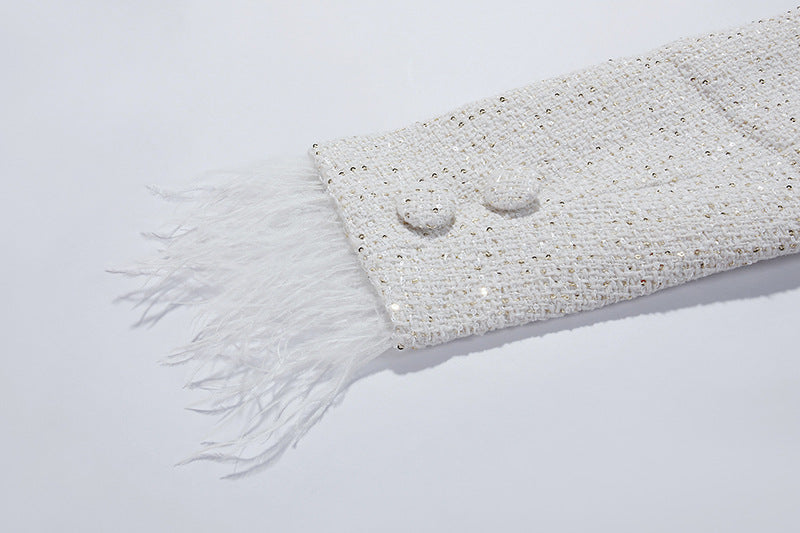 Elevate your evening wardrobe with this striking blazer mini dress, designed to command attention. The dramatic oversized bow detail at the neckline creates an instantly sophisticated silhouette, while luxurious feather embellishments add movement and texture. Tailored in crisp white, this piece transitions seamlessly from cocktail events to upscale dinners. The structured blazer construction provides polished refinement, while the mini length offers contemporary edge. Perfect for those who appreciate bold, statement-making design with refined execution.
