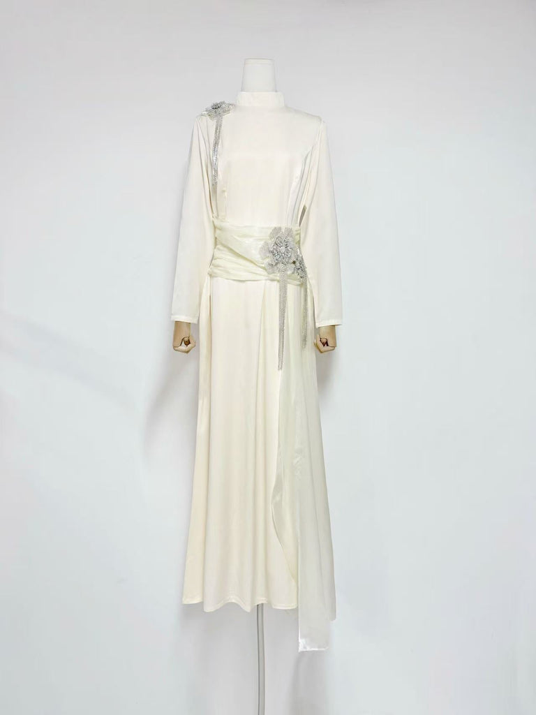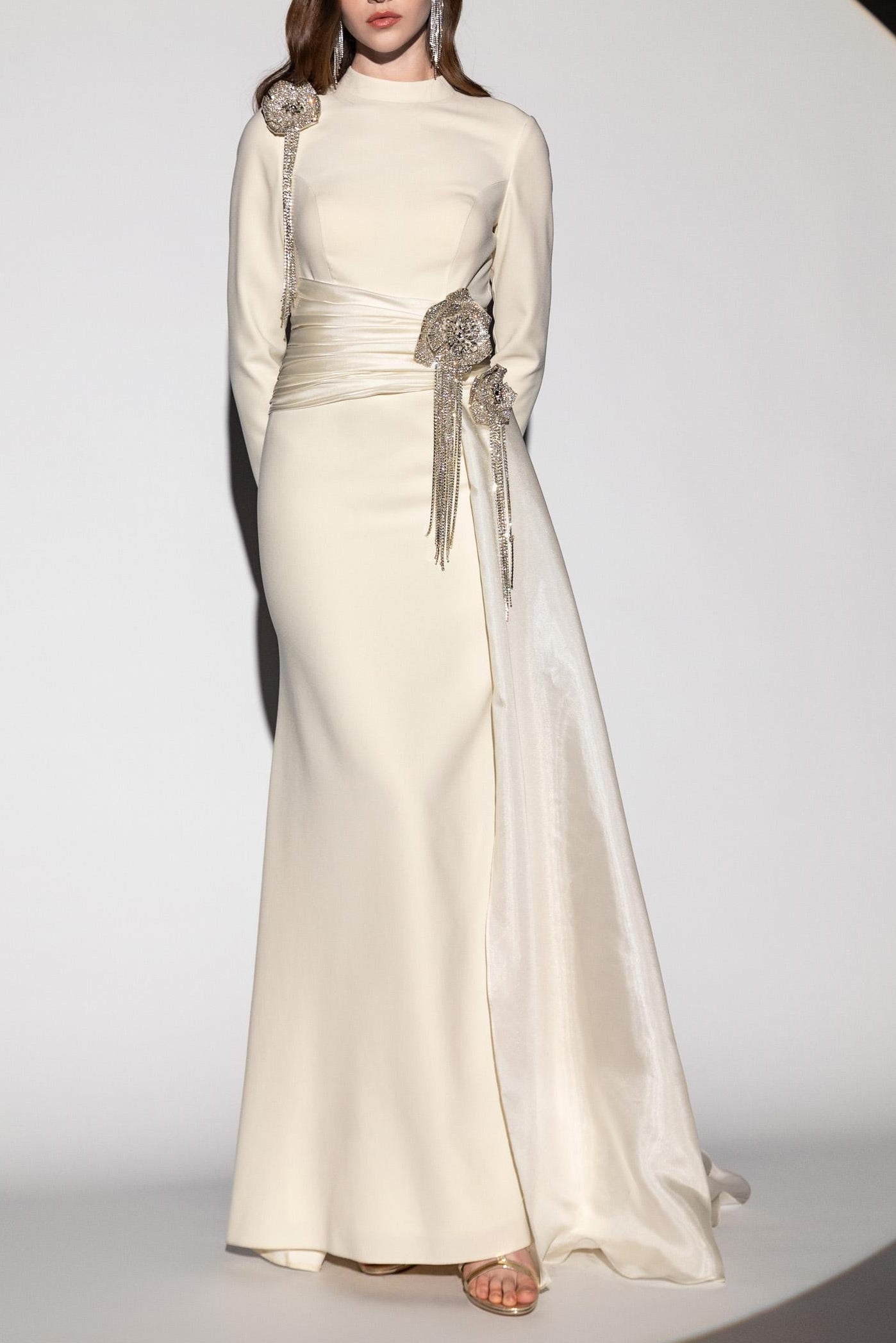 Elevate your evening wardrobe with this sophisticated maxi dress, featuring delicate lace detailing and graceful pleated construction. The long sleeves provide refined coverage while the flowing silhouette creates an elegant, elongated line. Crafted in a warm apricot tone, this piece transitions seamlessly from formal events to upscale occasions. The intricate crystal flower embellishments add a touch of understated luxury, making it an investment piece that commands attention through timeless design rather than bold statements. Perfect for those who appreciate quality craftsmanship and understated glamour.