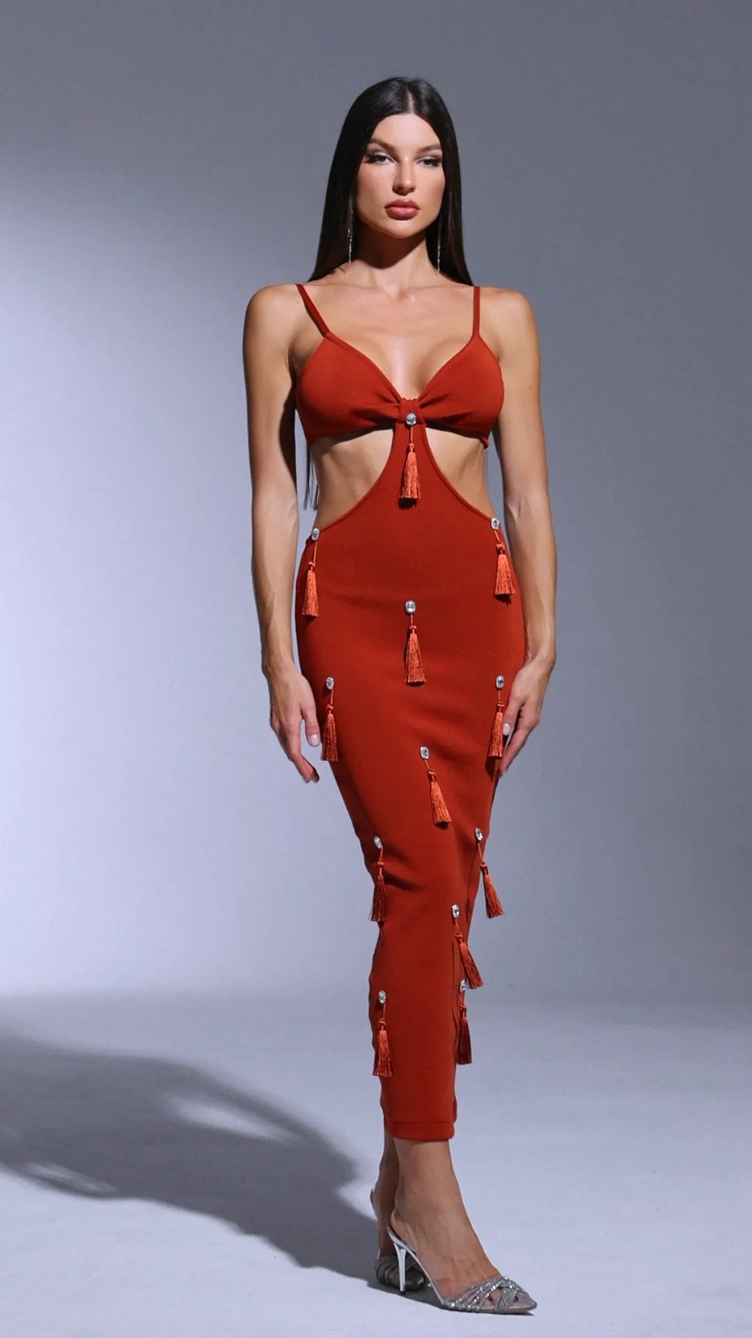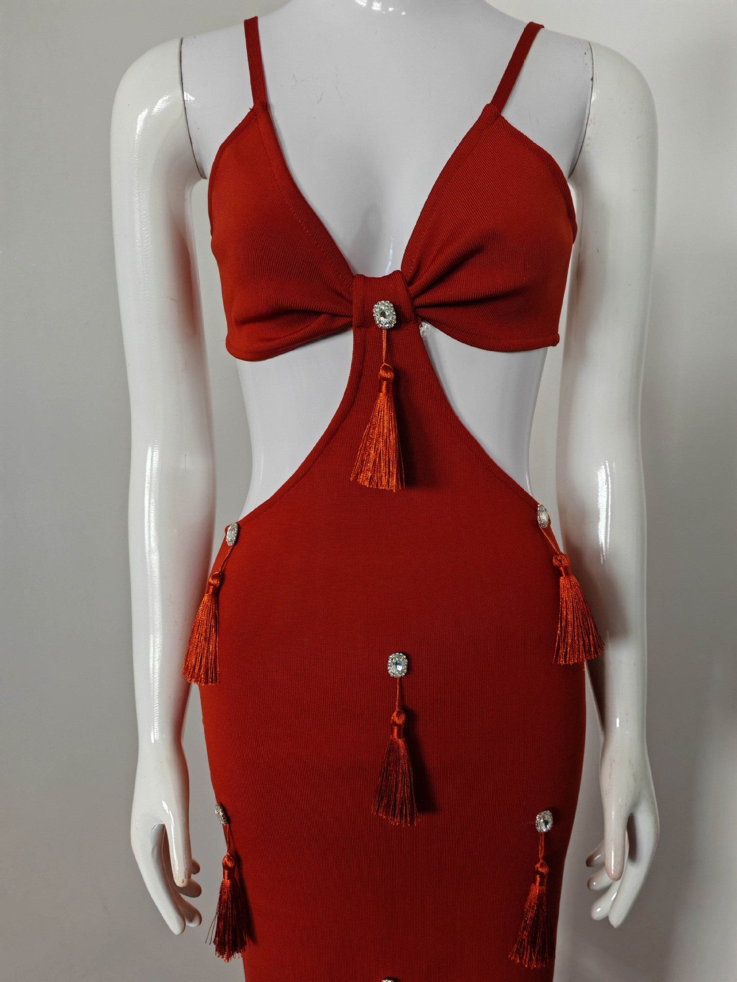 This Deep-V Diamond Tassels Bandage Maxi Dress in red combines sleek sophistication with bold design. Featuring a flattering deep-V neckline and a figure-hugging bandage silhouette, it enhances curves while providing support and comfort. The subtle diamond-patterned detailing adds texture and visual interest, while the tassel accents bring a touch of movement and drama. Ideal for elegant evening events, this maxi dress commands attention with its striking color and refined craftsmanship.