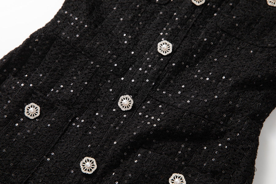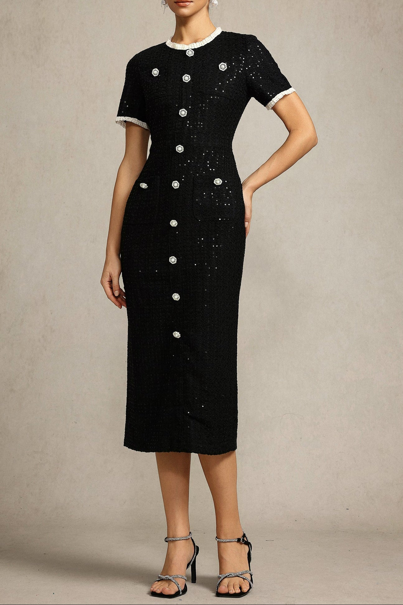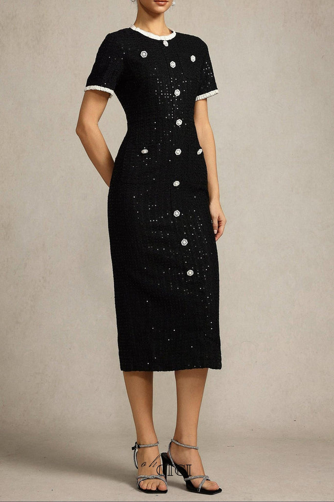 Elevate your evening wardrobe with this black sequin maxi dress, featuring a classic round neck and short sleeves for refined comfort. The full-length silhouette drapes elegantly, while shimmering sequins add a sophisticated sparkle perfect for formal events. Designed to offer both style and ease, this dress ensures you stand out with understated glamour.