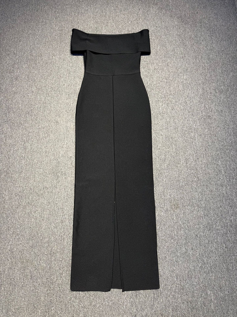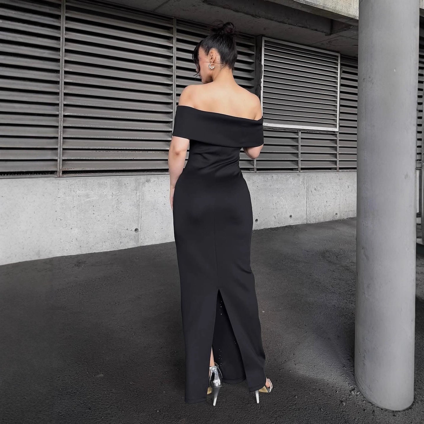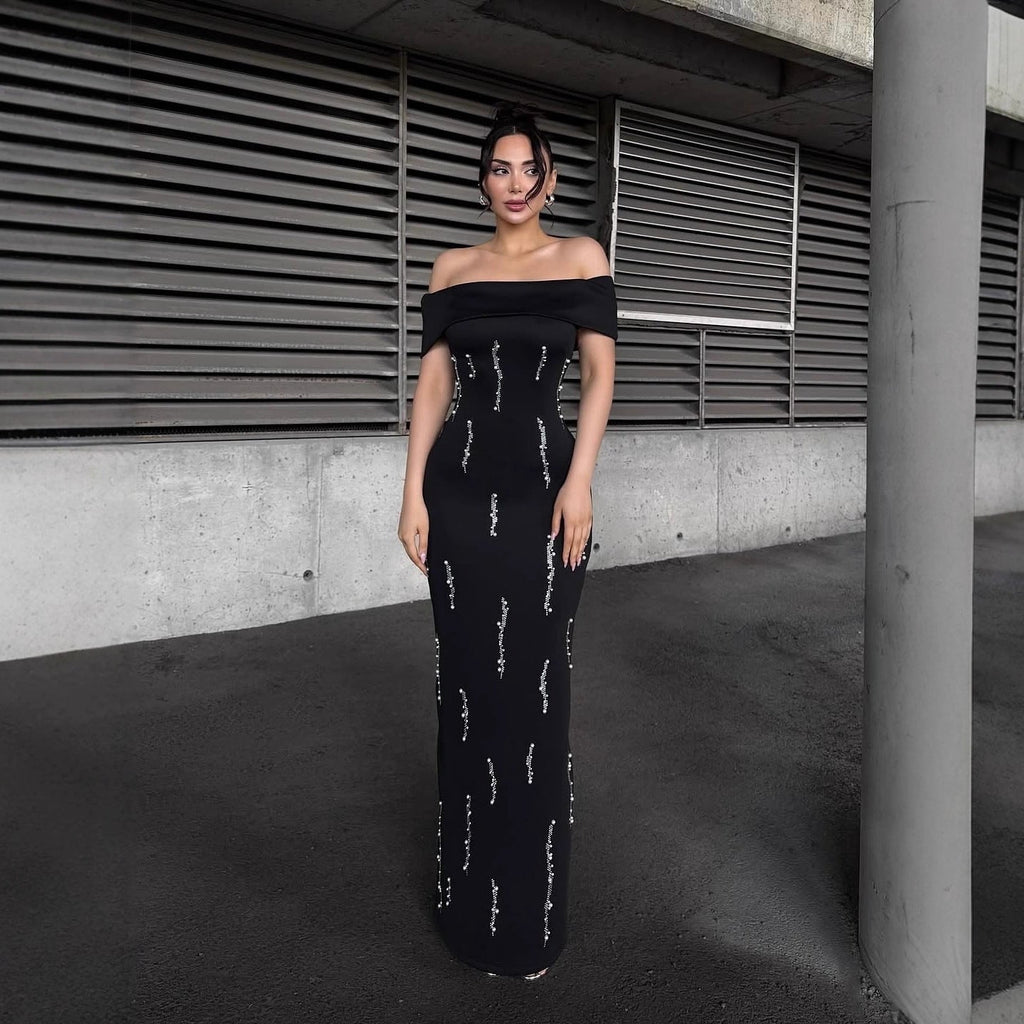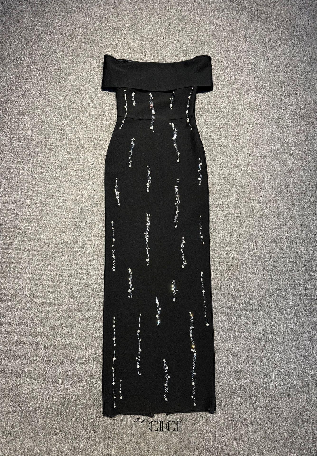 Elevate your evening wardrobe with the Laurel off-shoulder rhinestone bandage maxi dress. This sophisticated silhouette features a striking off-shoulder neckline and form-fitting bandage construction that flatters your curves. Intricate rhinestone embellishments cascade across the bodice, adding glamorous sparkle and dimension. The flowing maxi length provides elegant coverage while maintaining a dramatic, runway-ready aesthetic. Perfect for galas, formal events, or upscale celebrations where you want to make a memorable impression.