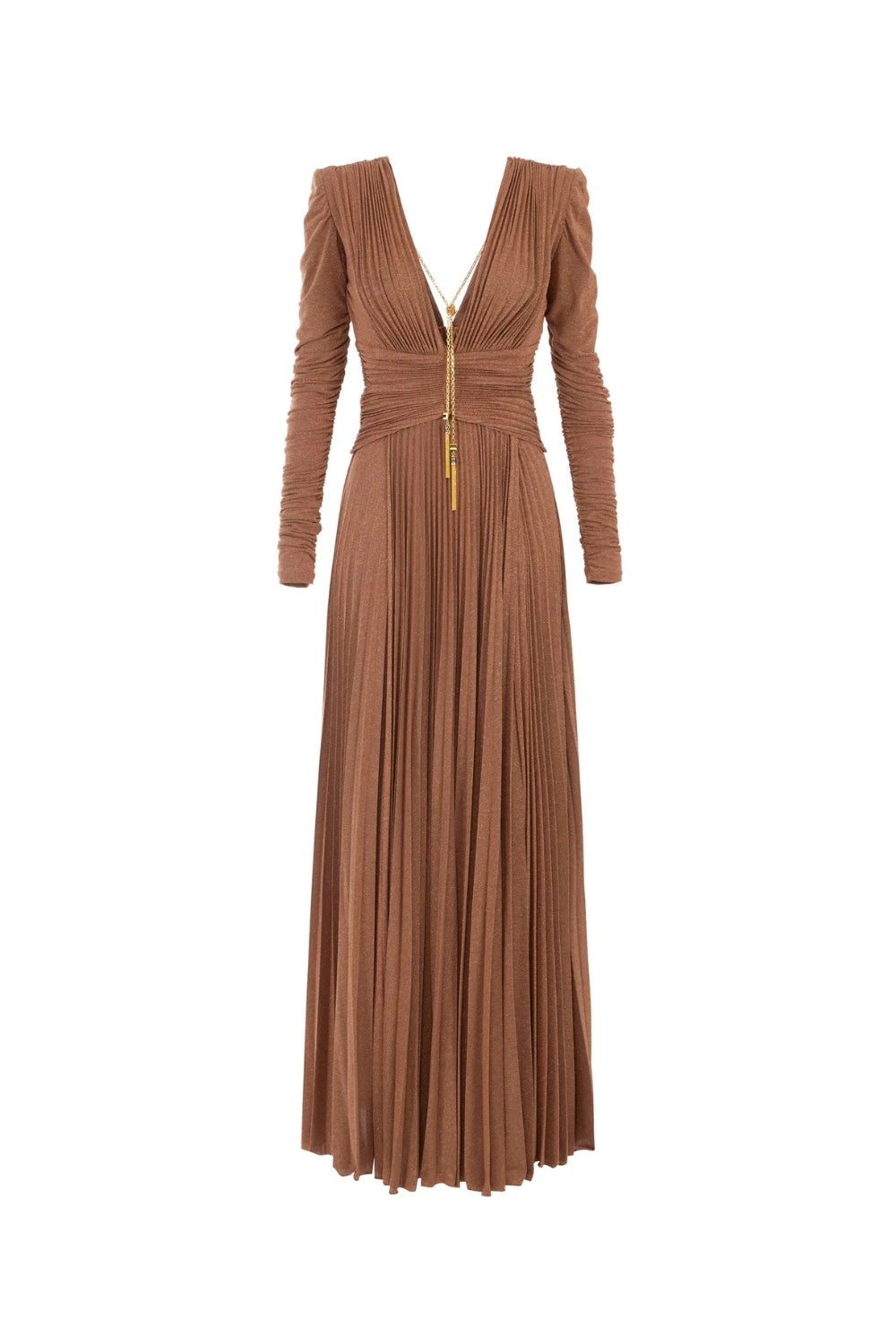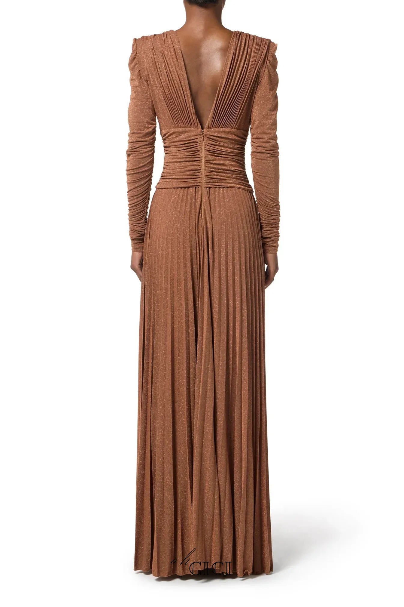 The meroy Deep V puff sleeve pleated maxi dress in brown combines sophisticated tailoring with contemporary design. The plunging V-neckline creates an elegant focal point, while voluminous puff sleeves add dimension and movement. Precise pleating throughout the skirt provides structure and graceful drape, elongating your silhouette. Rich brown tones offer versatility for both evening occasions and refined daytime wear. This statement piece balances bold styling elements with timeless appeal, making it an essential addition to any curated wardrobe.