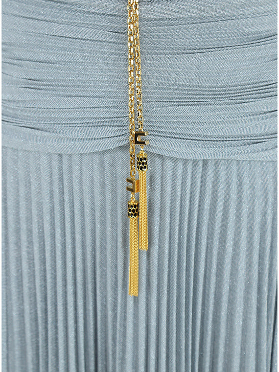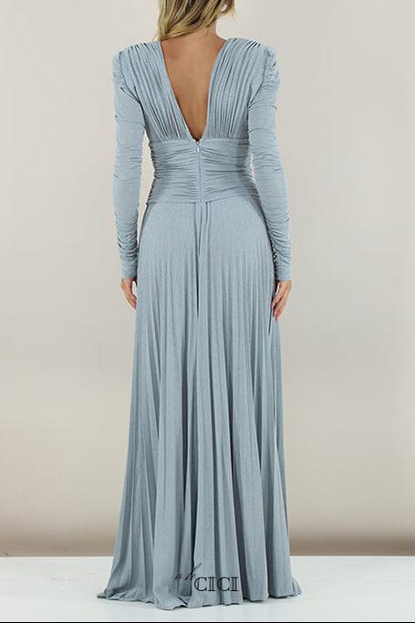The meroy Deep V puff sleeve pleated maxi dress combines sophisticated tailoring with contemporary design. The plunging V-neckline creates an elegant focal point, while voluminous puff sleeves add dimension and movement. Precise pleating throughout the skirt provides structure and graceful drape, elongating the silhouette. Rendered in a serene pale blue, this maxi dress transitions seamlessly from evening events to refined daytime occasions. The combination of dramatic sleeves and refined pleating demonstrates expert construction, making this piece a versatile investment for discerning wardrobes.