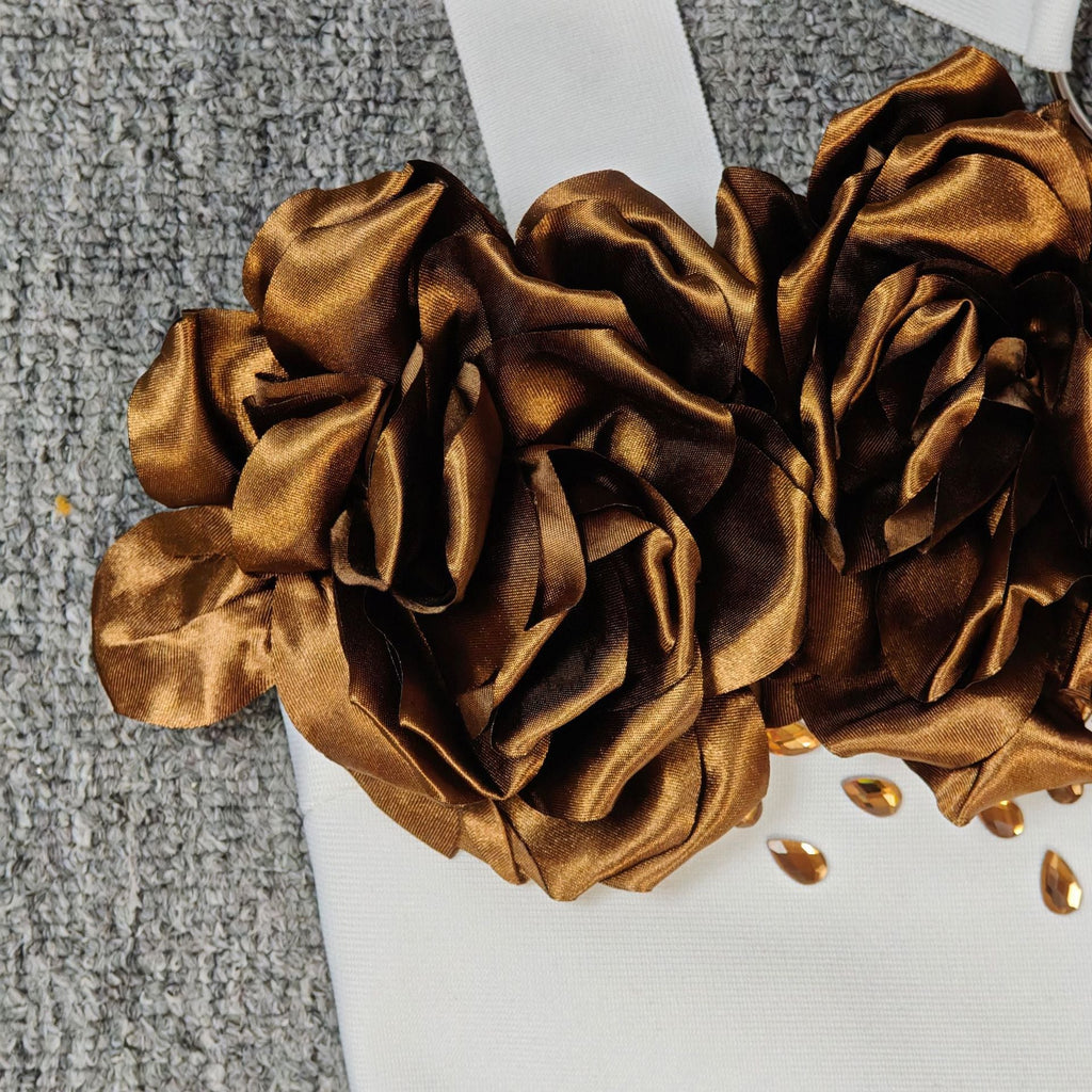 Crafted with precision engineering, this halterneck maxi dress features an intricate flower bandage construction that sculpts and flatters the silhouette. The strategic layering technique creates dimensional texture while the flowing maxi length offers sophisticated movement. The halterneck design provides secure support and an elegant neckline that frames the shoulders beautifully. Perfect for evening events or upscale occasions, this piece combines architectural tailoring with refined femininity for a statement-making look.