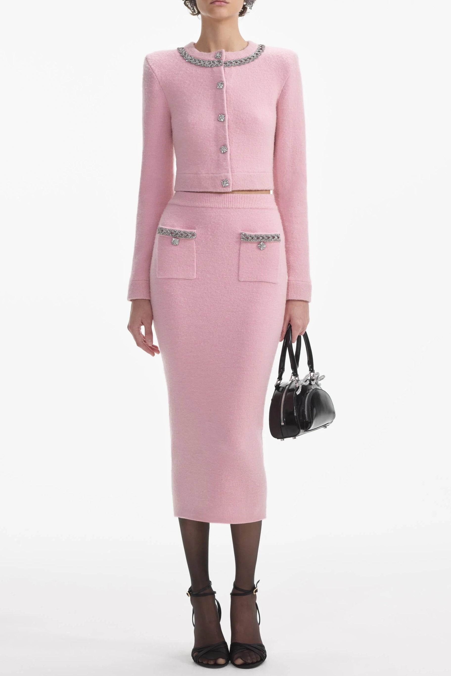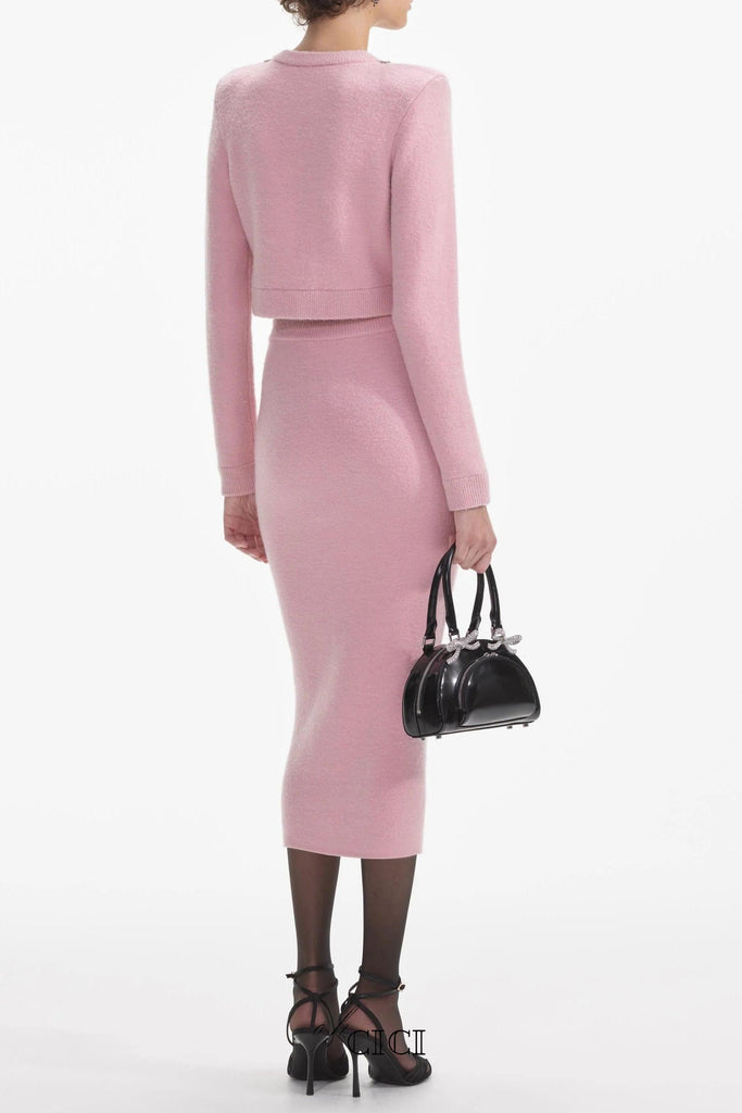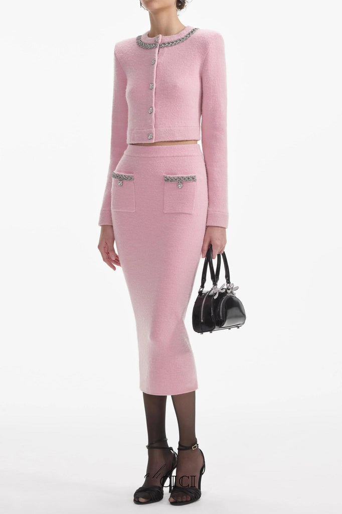 Elevate your wardrobe with this sophisticated two-piece ensemble featuring a coordinated jacket and skirt in a refined shirley pink hue. The embellished detailing adds an element of refined elegance, making this set ideal for special occasions, upscale events, or elevated everyday styling. The matching silhouette creates a polished, intentional look that demonstrates sartorial confidence. Perfect for those who appreciate coordinated pieces that deliver both visual impact and versatility in their collection.
