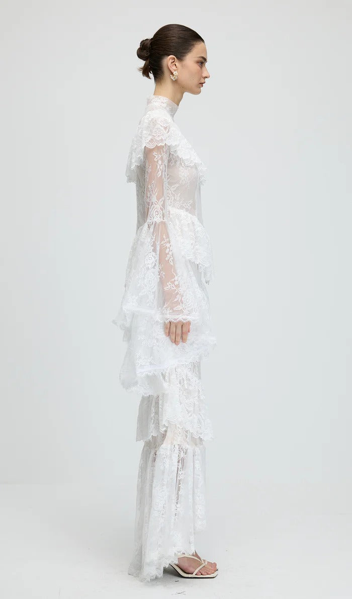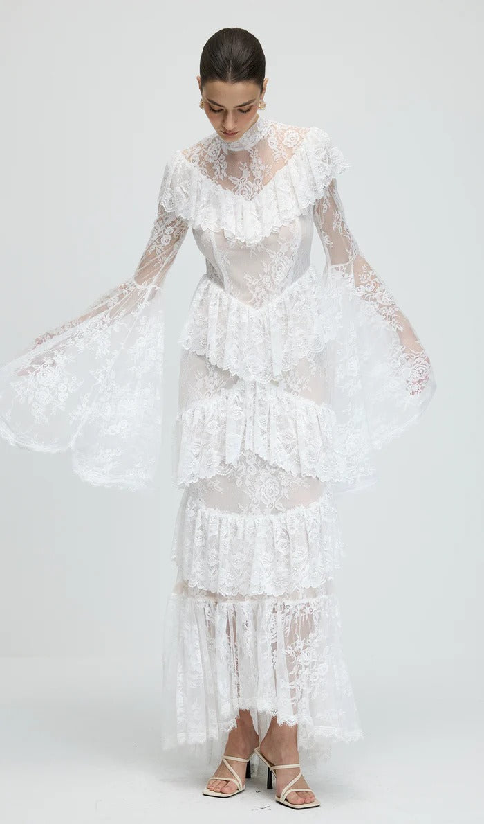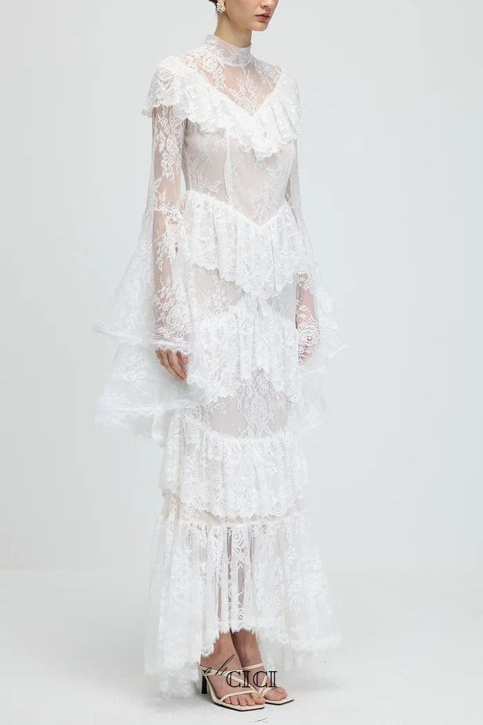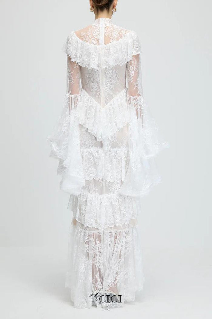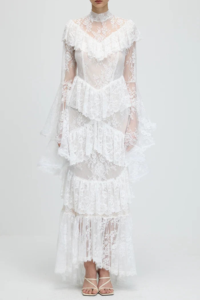 The Sylvia Sheer Lace Trumpet Sleeve Maxi Dress in White offers an elegant silhouette with its delicate sheer lace fabric and gracefully flared trumpet sleeves. Designed for a refined look, this floor-length dress combines timeless white lace with a flattering maxi cut, perfect for formal events or sophisticated gatherings. Its intricate lace detailing and flowing shape provide both comfort and style, making it a standout choice for those seeking a blend of classic charm and modern elegance.