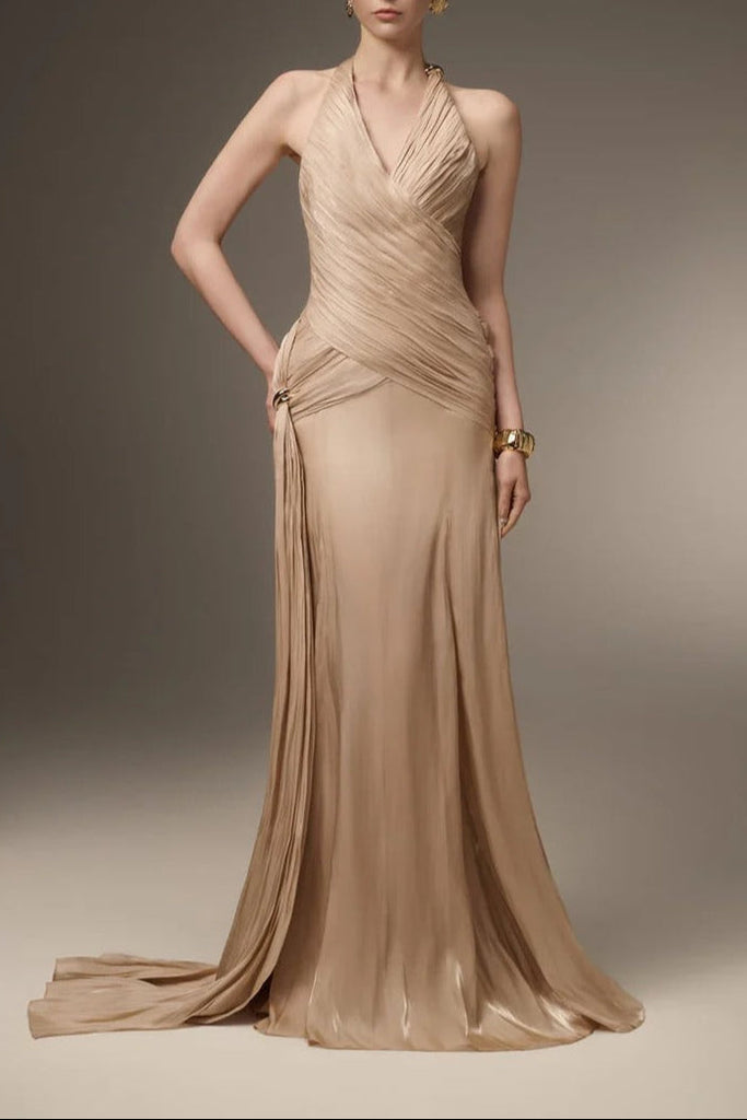 Corset Waist Silk Blend halter Floor Length Dress in champagne