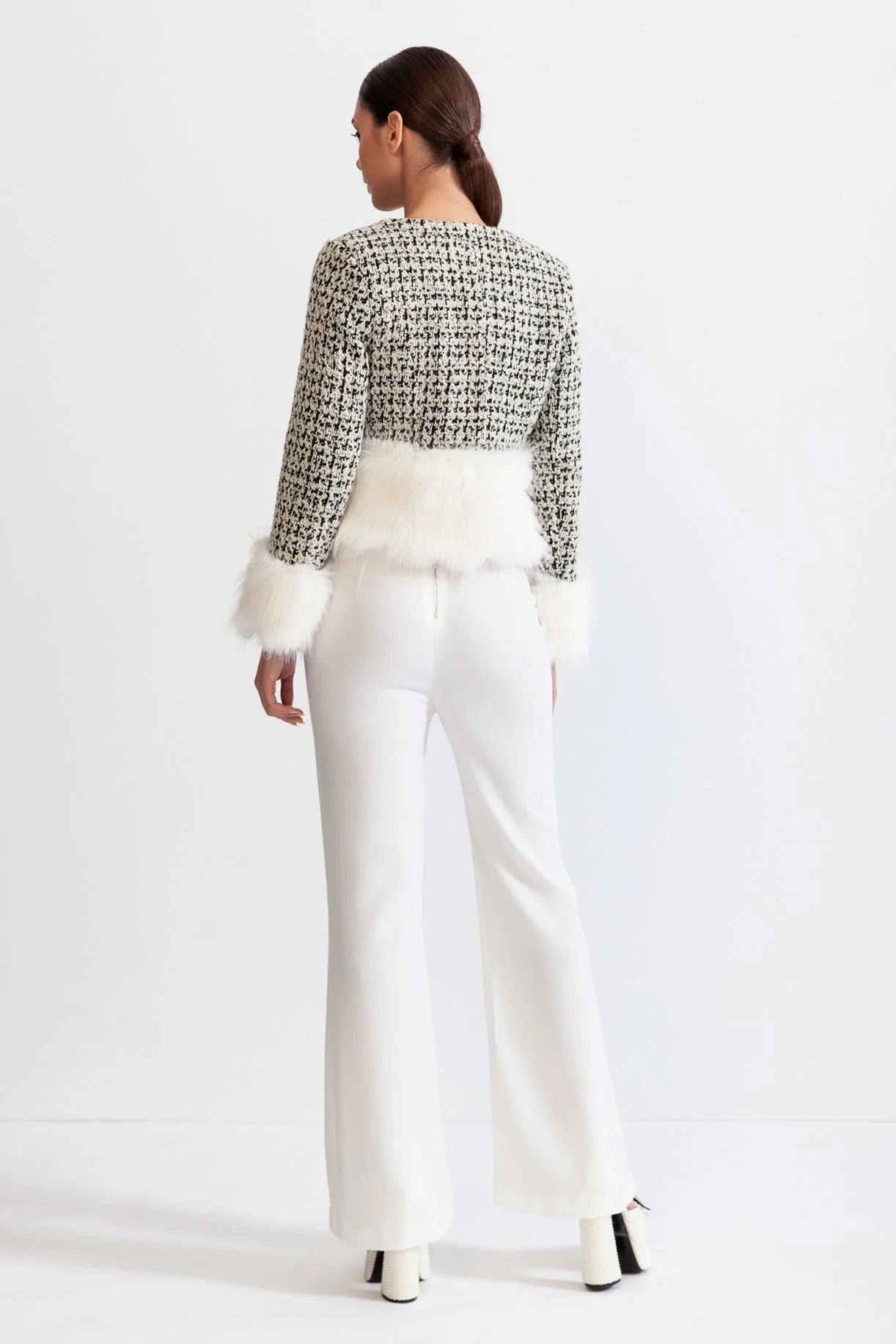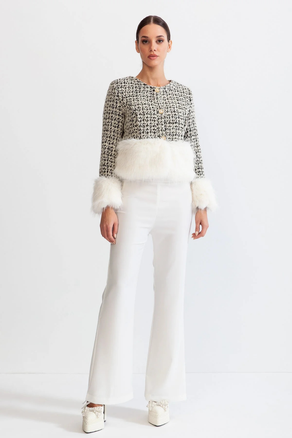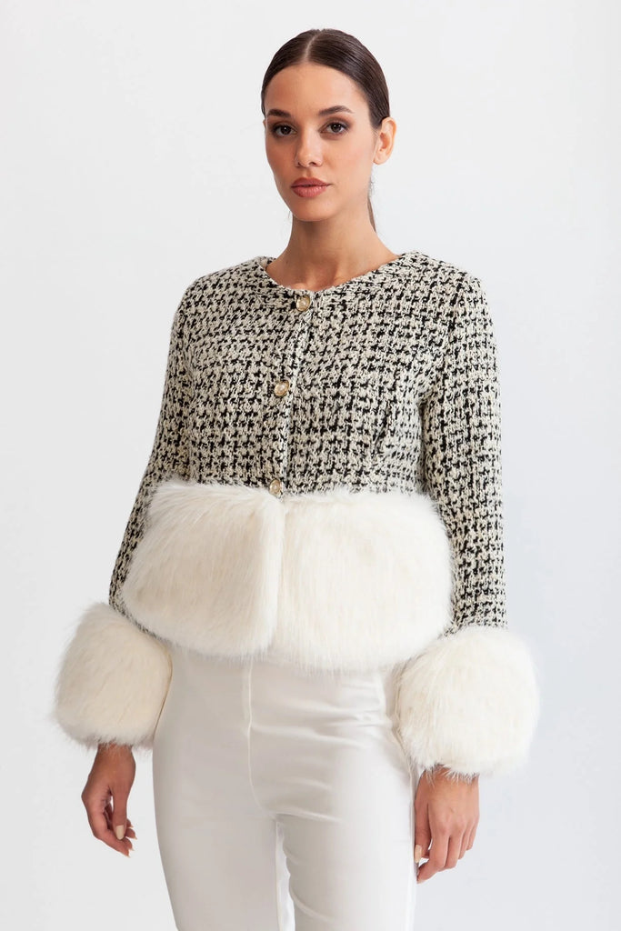 Elevate your winter wardrobe with this sophisticated tweed jacket, adorned with plush faux fur trims at the hem and cuffs. The classic pattern combines with luxurious details, making it a chic option for both casual and formal looks.