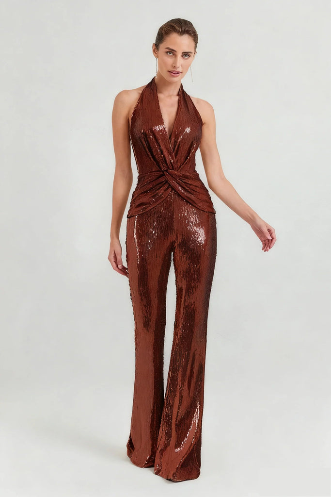 Elevate your evening wardrobe with this expertly designed sequin jumpsuit. The halterneck silhouette provides confident support while the plunging V-neckline creates an alluring focal point. A high-waisted cut defines your natural proportions, while flowing flared legs deliver sophisticated movement and visual elongation. Rendered in luxurious brown with eye-catching sequin embellishment, this piece commands attention at galas, cocktail events, and formal occasions. An investment in timeless glamour that transcends seasonal trends.