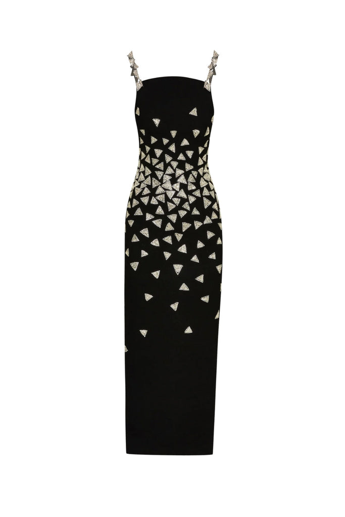 Elevate your evening with the Crystal Triangle Maxi Bandage Dress, a refined blend of elegance and modern design. This dress features a flattering bandage silhouette that contours the body, enhanced by delicate crystal triangle accents for a subtle sparkle. Its maxi length adds a graceful flow, perfect for formal occasions or upscale events. Experience sophistication and confidence in every step with this stunning statement piece.