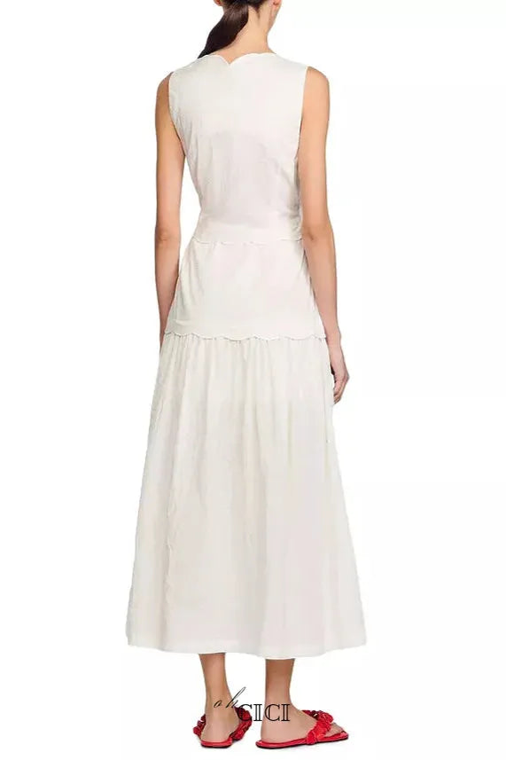 Elevate your wardrobe with the Scallop Trim V-neck Crinkled Maxi Dress in ecru. This dress features a delicate scallop trim that enhances the elegant V-neckline, while the crinkled fabric adds subtle texture and movement. Its maxi length offers a graceful silhouette, perfect for both casual and formal occasions. The soft ecru shade provides a versatile, timeless look that complements various accessories and styles. Designed for comfort and sophistication, this dress is an expert choice for effortless, refined dressing.