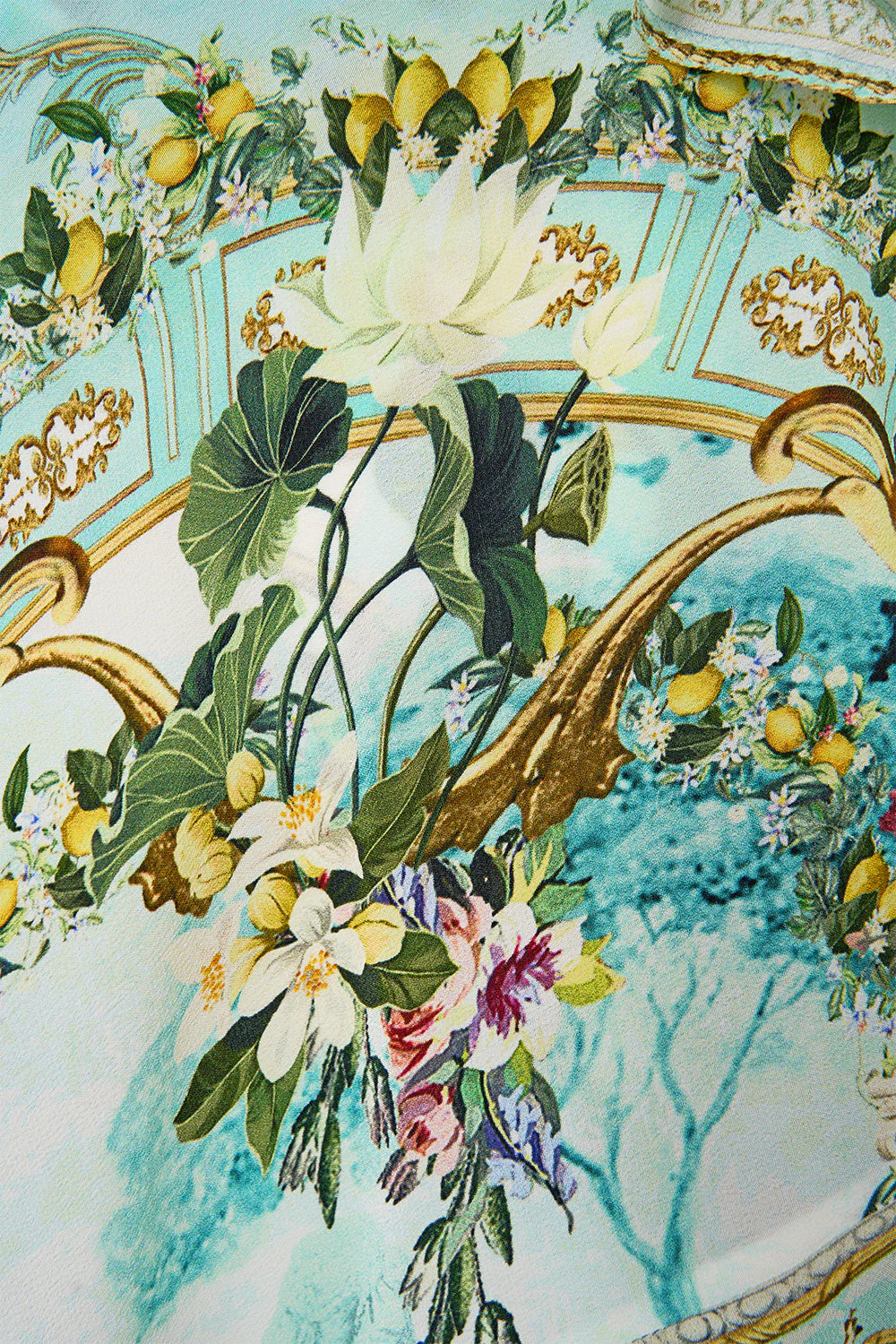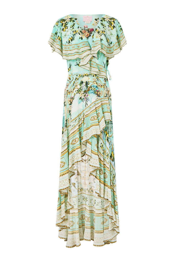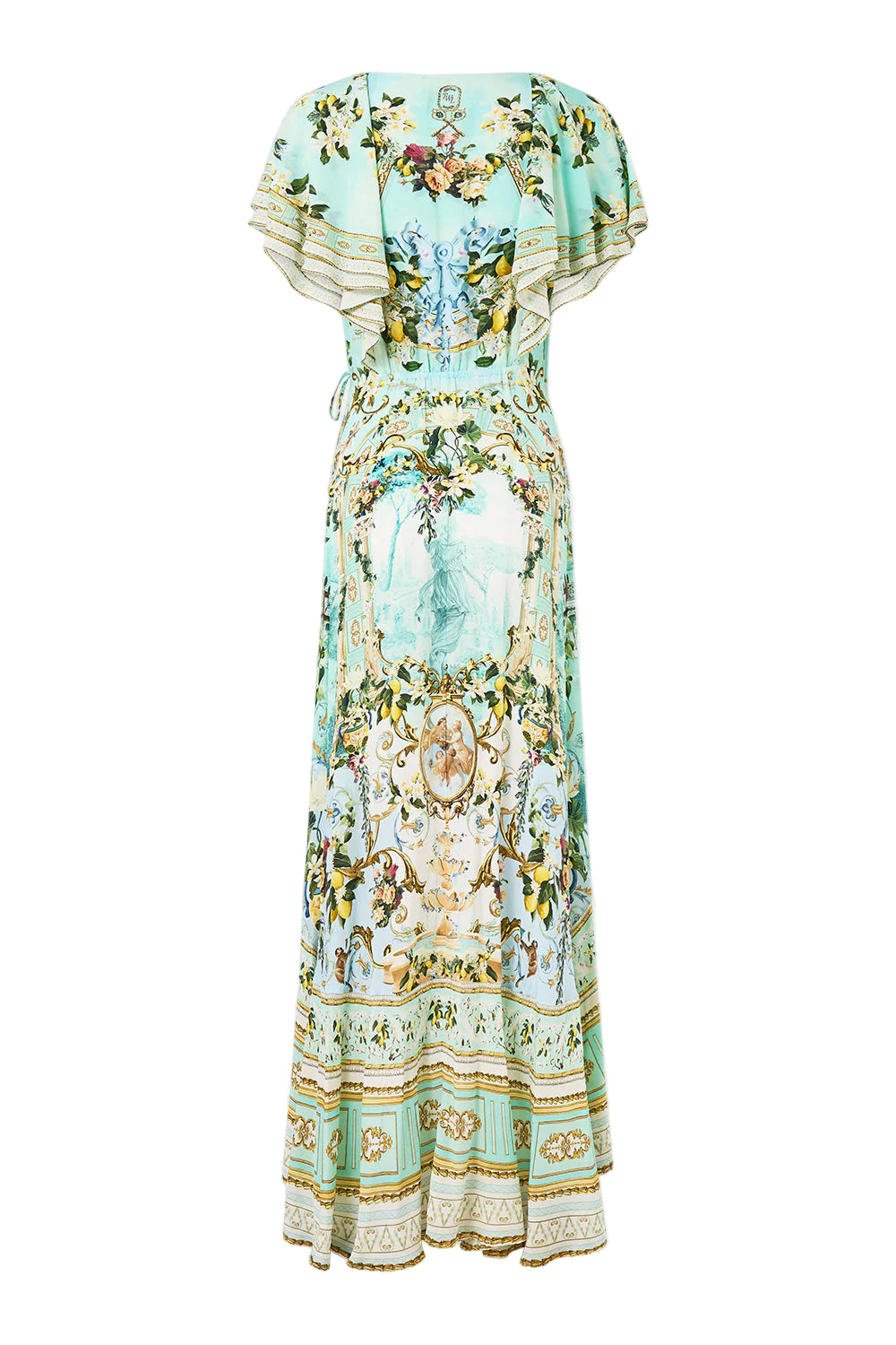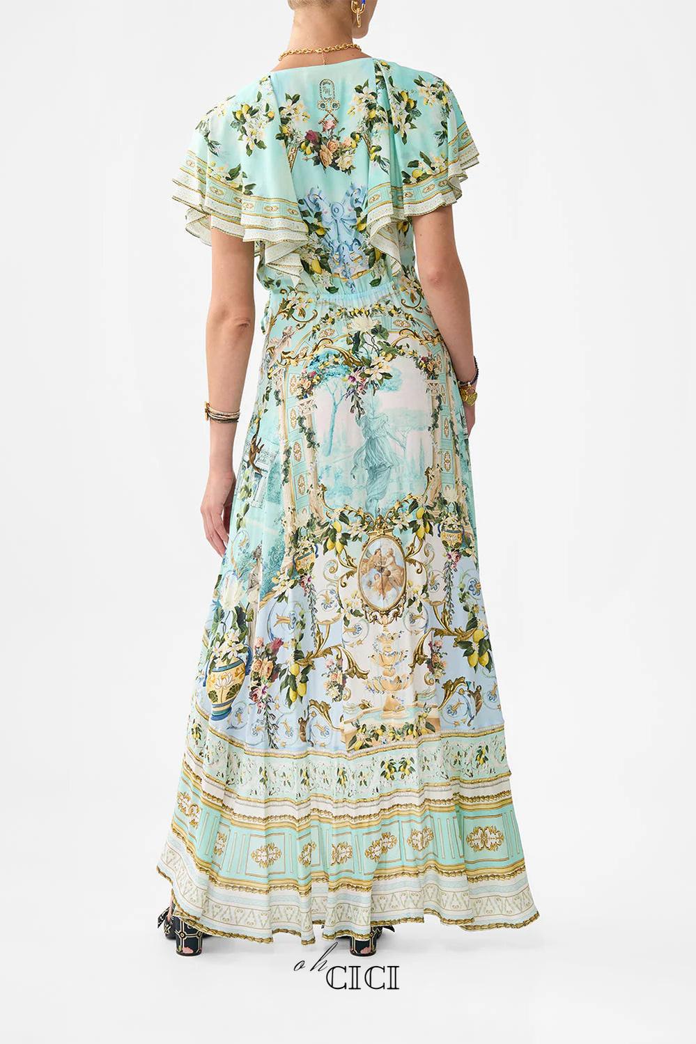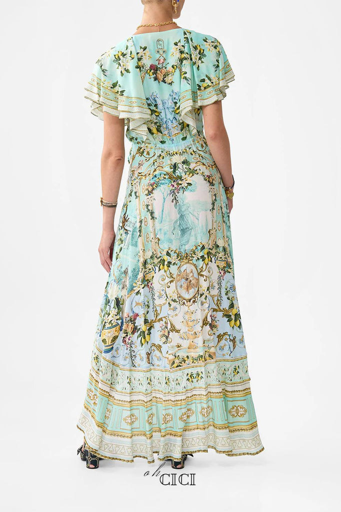 Elevate your wardrobe with this green-multi printed silk maxi dress, featuring a sophisticated V-neck and delicate ruffled detailing. The irregular hemline adds a contemporary edge, while the lightweight silk fabric ensures exceptional comfort and fluid movement. Perfect for formal occasions or stylish daytime events, this dress combines expert craftsmanship with a flattering silhouette.