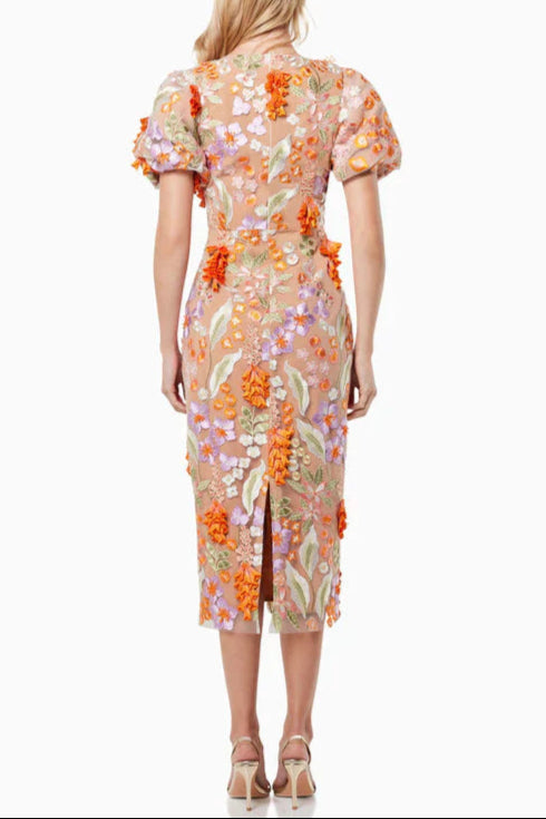 This orange midi dress features delicate mesh fabric adorned with intricate 3D floral embroidery, creating a sophisticated textured look. The V-neckline and puff sleeves add a refined silhouette, balancing elegance with a modern touch. Perfect for occasions that call for a statement piece, this dress combines artistry and style in a flattering, comfortable design.