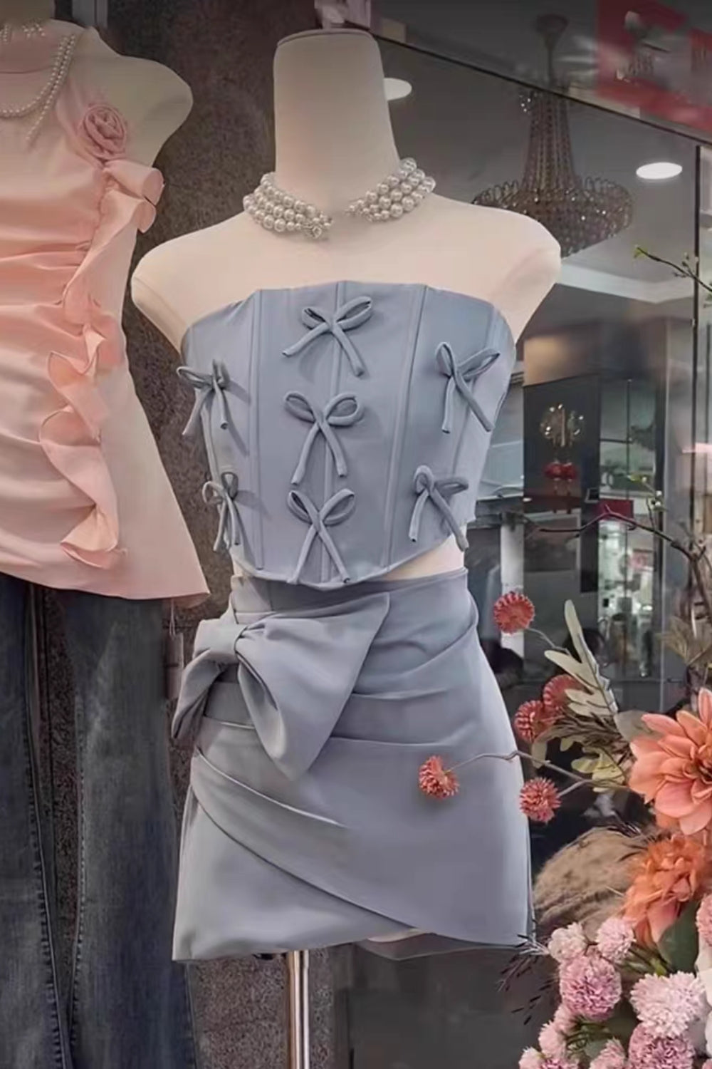 Get double the style with our Bow Embellished Two-Piece Set In Blue! This quirky set features playful bow embellishments for a unique and fun look. Perfect for those who don't take themselves too seriously, this set will surely make a statement.