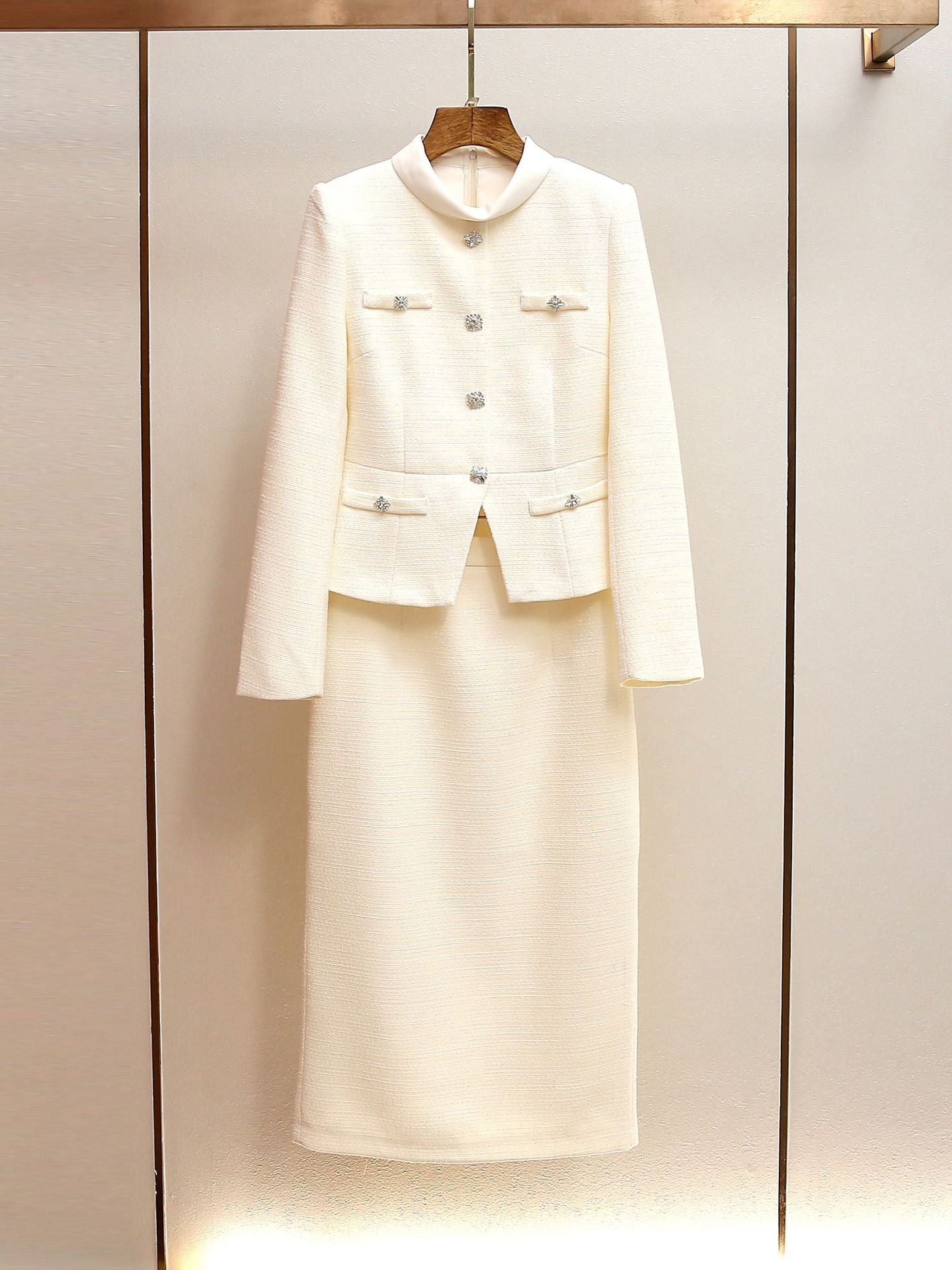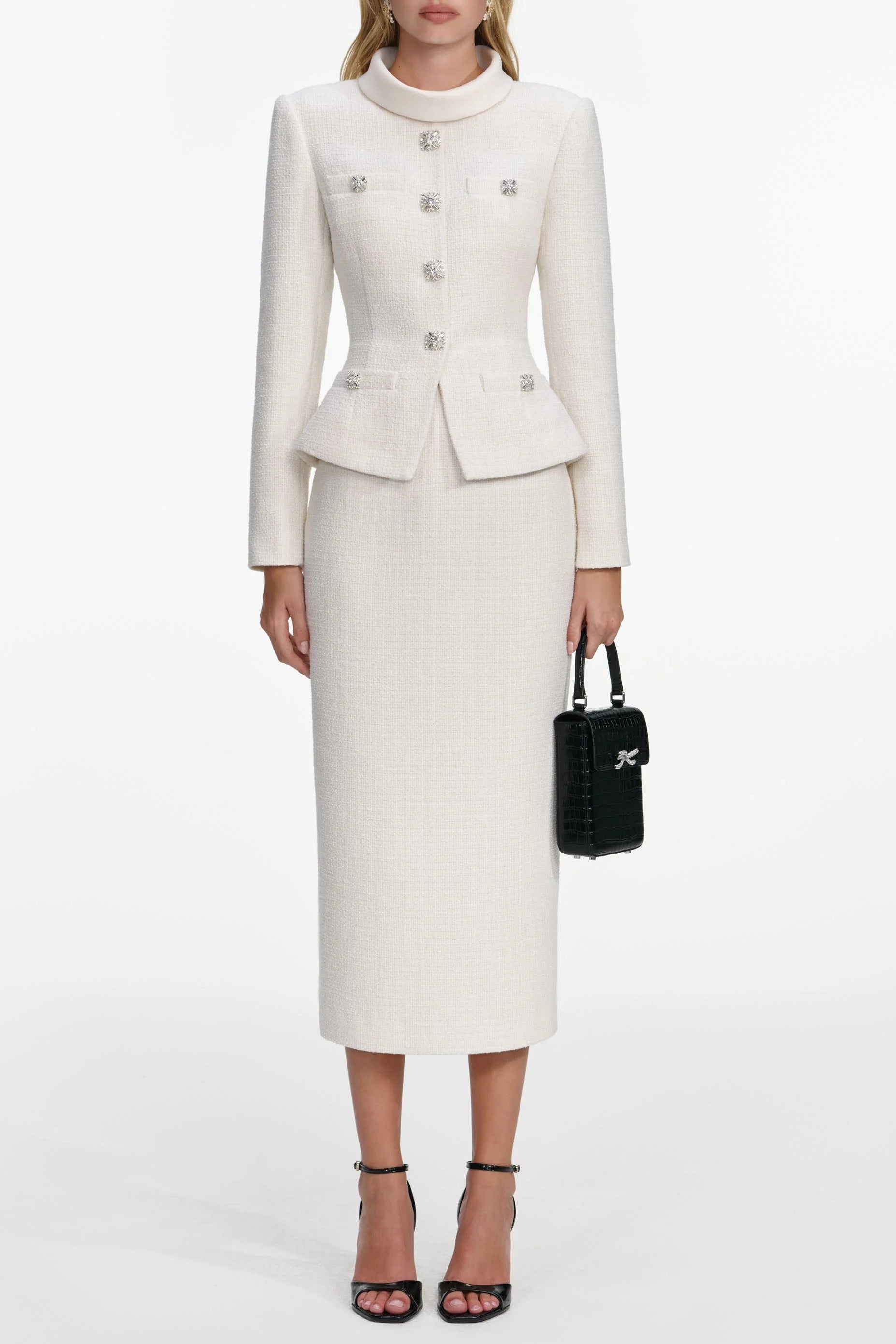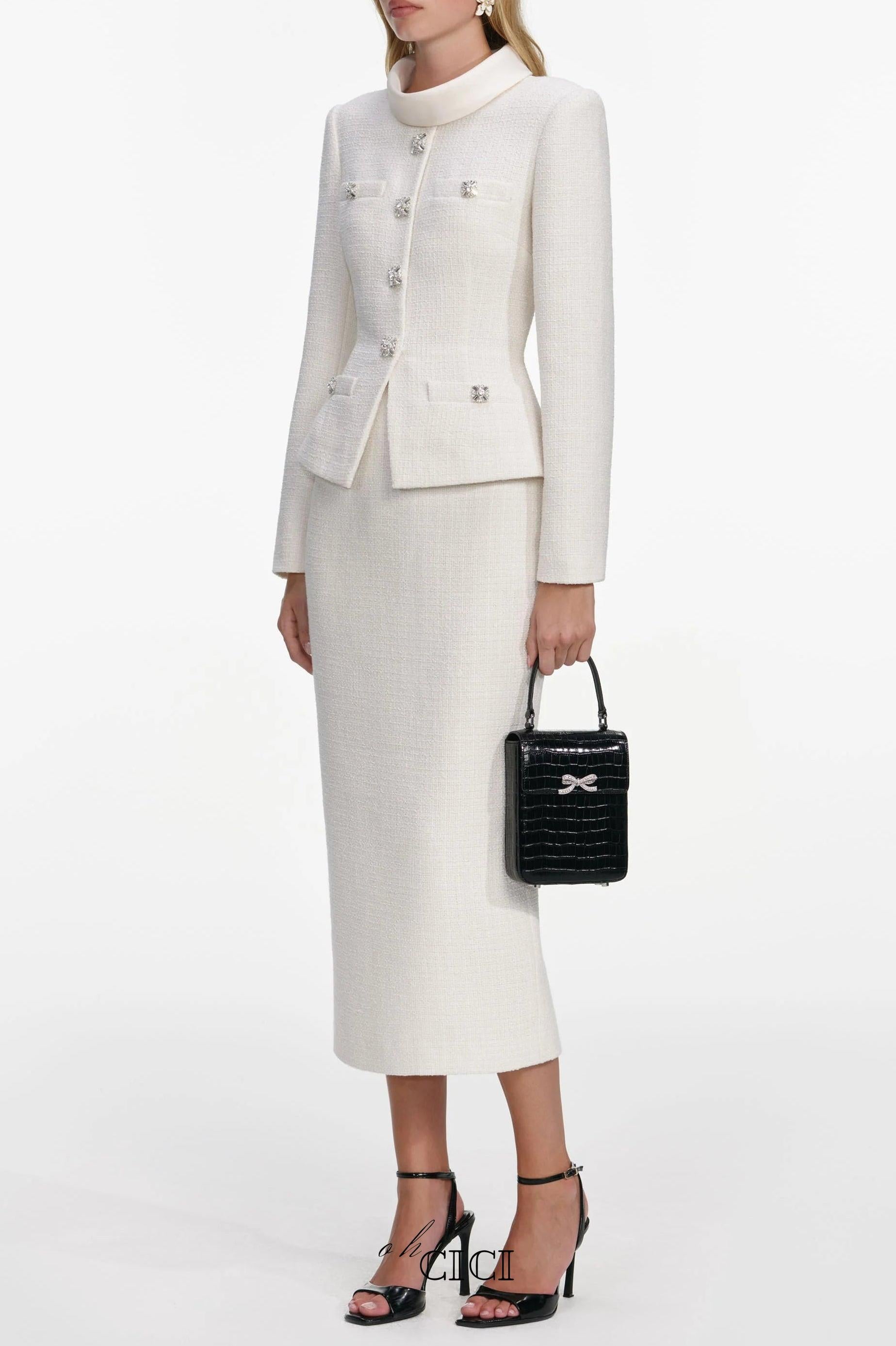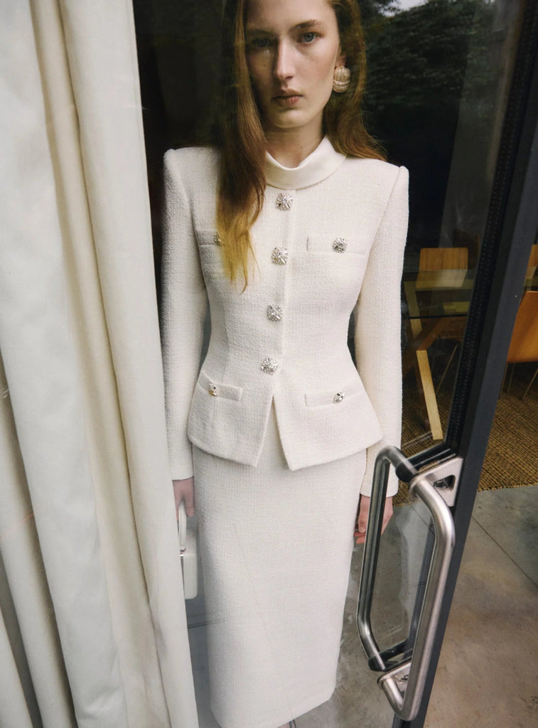 Elevate your wardrobe with the michaelia Cream Boucle Tailored Midi Dress set. This sophisticated ensemble features a luxurious boucle fabric in a timeless cream tone, expertly tailored for a polished silhouette. The midi length strikes the perfect balance between elegance and versatility, making it ideal for both professional settings and special occasions. The structured fit flatters your figure while the quality construction ensures lasting wear. Complete with coordinating pieces, this set gives you everything you need to look and feel confident. A wardrobe staple that transitions seamlessly from day to evening.
