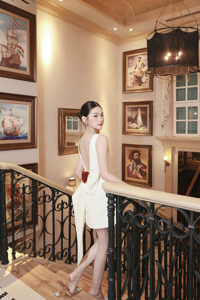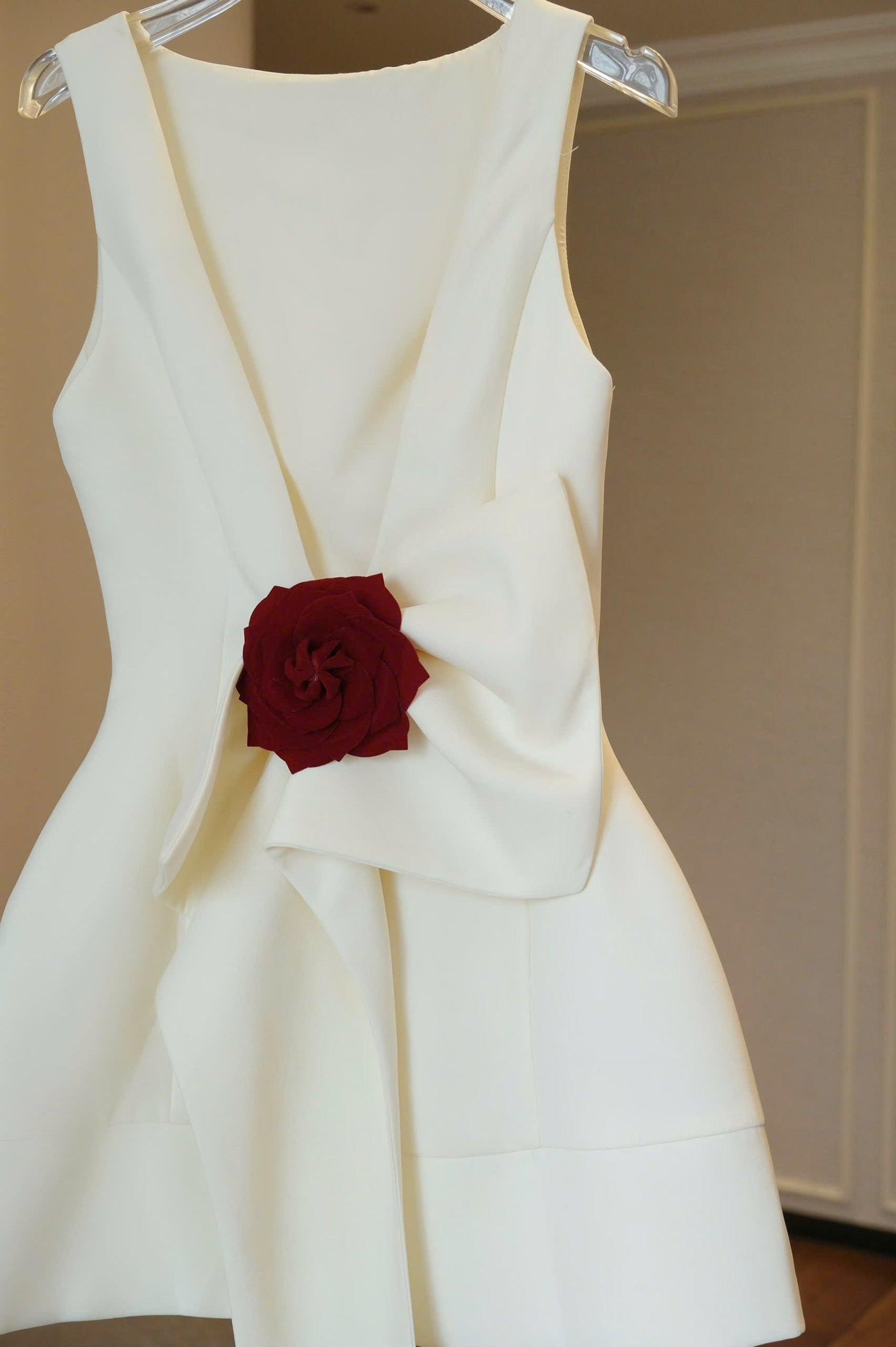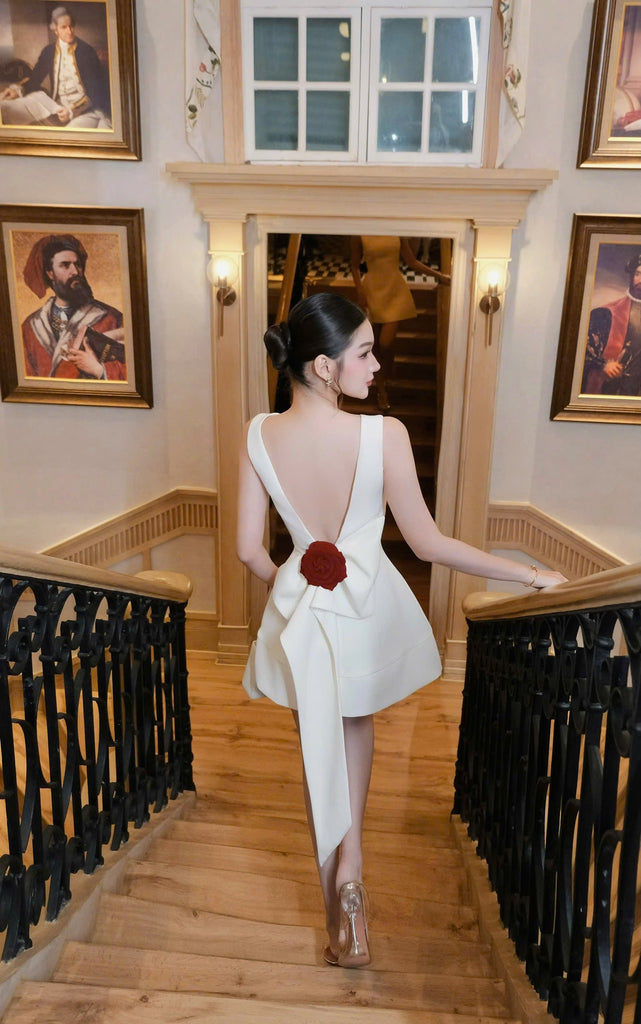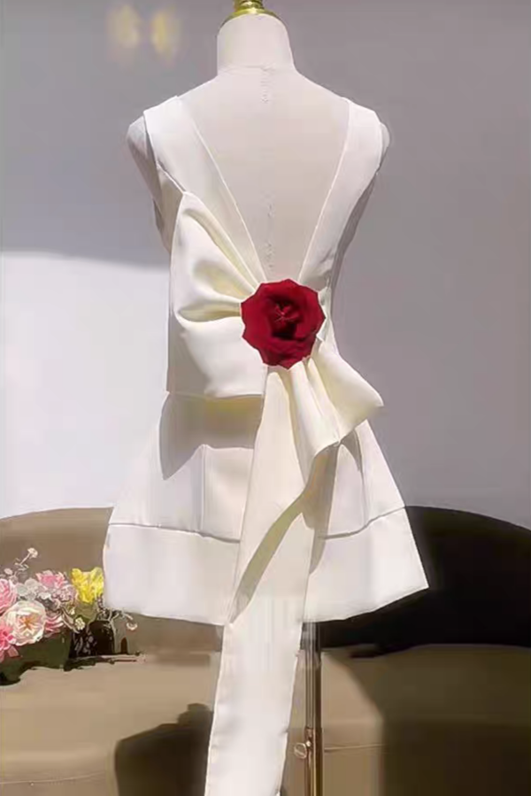 Elevate your style with our Joanna backless flower bow embellished mini dress in white. The elegant design and intricate bow detailing make this dress a must-have for any special occasion. The backless feature adds a touch of sensuality and femininity, while the pure white color radiates sophistication. Perfect for a chic and graceful look.